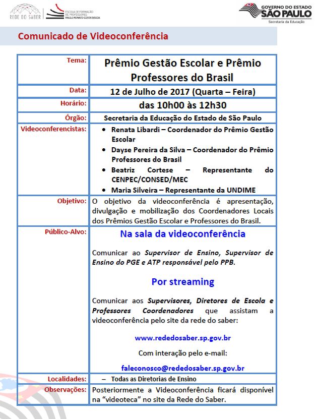 ATENÇÃO SENHORES DIRETORES – COMUNICADO DA VIDEOCONFERÊNCIA – PRÊMIO GESTÃO ESCOLAR E PRÊMIO PROFESSORES DO BRASIL 12/07/2017. 10-07-17 Enviar por e-mail NÚCLEO PEDAGÓGICO LEIA TAMBÉM EDITAL CGP, DE 04 DE FEVEREIRO DE 2026 – E.E PADR ANTONIO VIEIRA. EDITAL DE ENTREVISTAS PARA PROFESSOR EDUCAÇÃO BÁSICA II/ PROFESSOR DE ENSINO FUNDAMENTAL E MÉDIO PARA CREDENCIAMENTO NO PEI EM 2026. EDITAL Nº 01/2026 PARA PROCESSO SELETIVO DE DOCENTES PARA O PROGRAMA PROFESSOR TUTOR ANOS INICIAIS 2026. EDITAL – VAGA DE COORDENAÇÃO DE GESTÃO PEDAGÓGICA ANOS INICIAIS – EF – EE DAILY RESENDE FRANÇA PROFESSOR, DE 29 DE JANEIRO DE 2026.