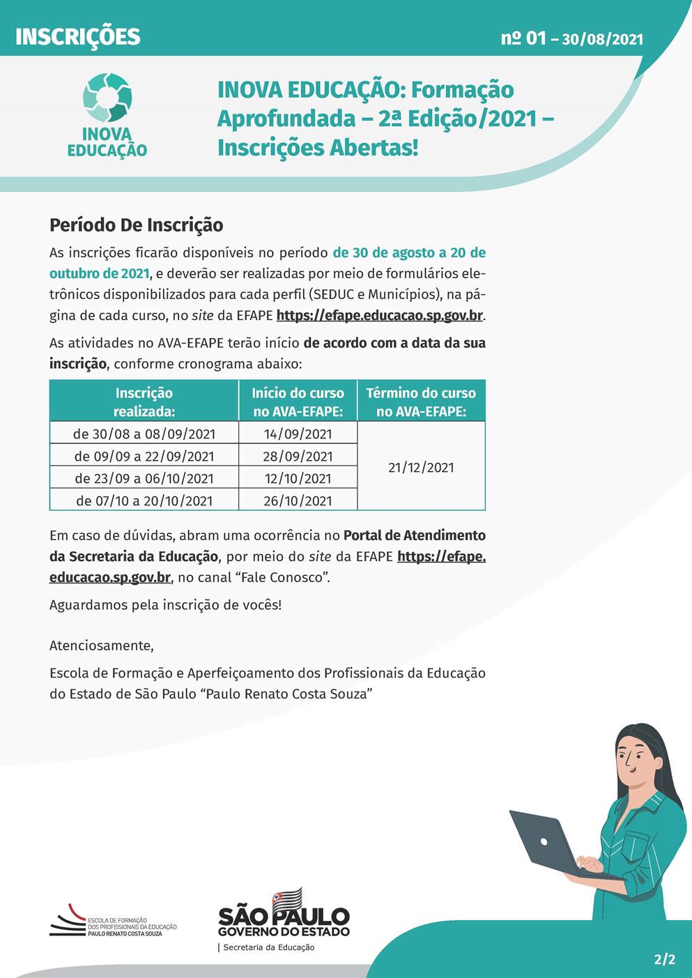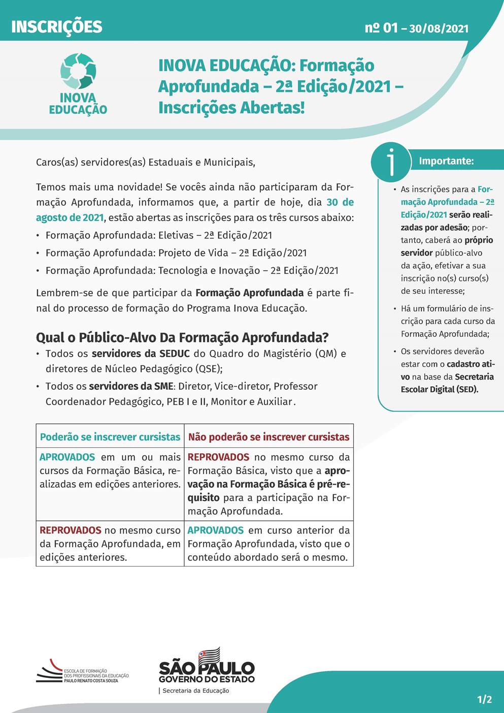 BOLETIM 01 | INOVA EDUCAÇÃO: FORMAÇÃO APROFUNDADA – 2ª EDIÇÃO/2021 – INSCRIÇÕES ABERTAS. 30-08-21 Enviar por e-mail . LEIA TAMBÉM EDITAL 01/2026 – PROCESSO SELETIVO PARA ATRIBUIÇÃO DE AULAS DE PROFESSOR ORIENTADOR DE CONVIVÊNCIA – POC – UNIDADE REGIONAL DE ENSINO CENTRO. EDITAL SALA DE LEITURA, DE 29 DE JANEIRO DE 2026 EDITAL DE ABERTURA DE INSCRIÇÕES PARA AGENTE DE ORGANIZAÇÃO ESCOLAR – EE TARCÍSIO ÁLVARES LOBO. EDITAL DE ABERTURA DE PROCESSO SELETIVO PARA DESIGNAÇÃO DE GOE, DE 28 DE JANEIRO DE 2026 – E.E CAETANO DE CAMPOS.