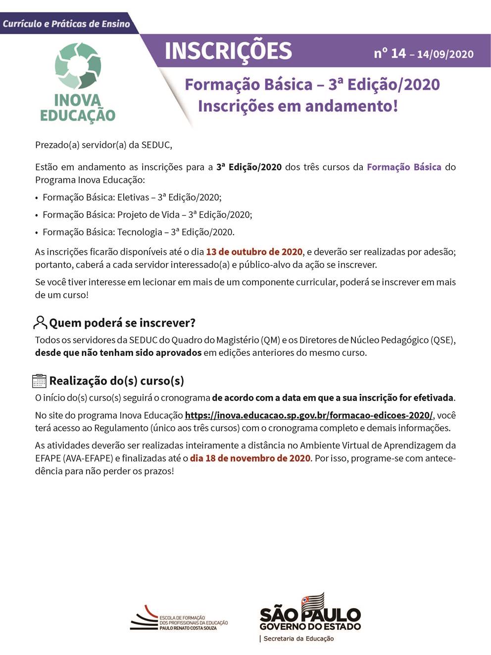 BOLETIM 14 FORMAÇÃO BÁSICA – 3ª EDIÇÃO/2020 – INSCRIÇÕES EM ANDAMENTO. 14-09-204 de dezembro de 2020 Enviar por e-mail NPE DER CTR. LEIA TAMBÉM EDITAL DE ENTREVISTAS PARA PROFESSOR EDUCAÇÃO BÁSICA II/ PROFESSOR DE ENSINO FUNDAMENTAL E MÉDIO PARA CREDENCIAMENTO NO PEI EM 2026. EDITAL Nº 01/2026 PARA PROCESSO SELETIVO DE DOCENTES PARA O PROGRAMA PROFESSOR TUTOR ANOS INICIAIS 2026. EDITAL – VAGA DE COORDENAÇÃO DE GESTÃO PEDAGÓGICA ANOS INICIAIS – EF – EE DAILY RESENDE FRANÇA PROFESSOR, DE 29 DE JANEIRO DE 2026. ATENÇÃO! INSCRIÇÕES ABERTAS PARA AS AULAS OLÍMPICAS 2026!