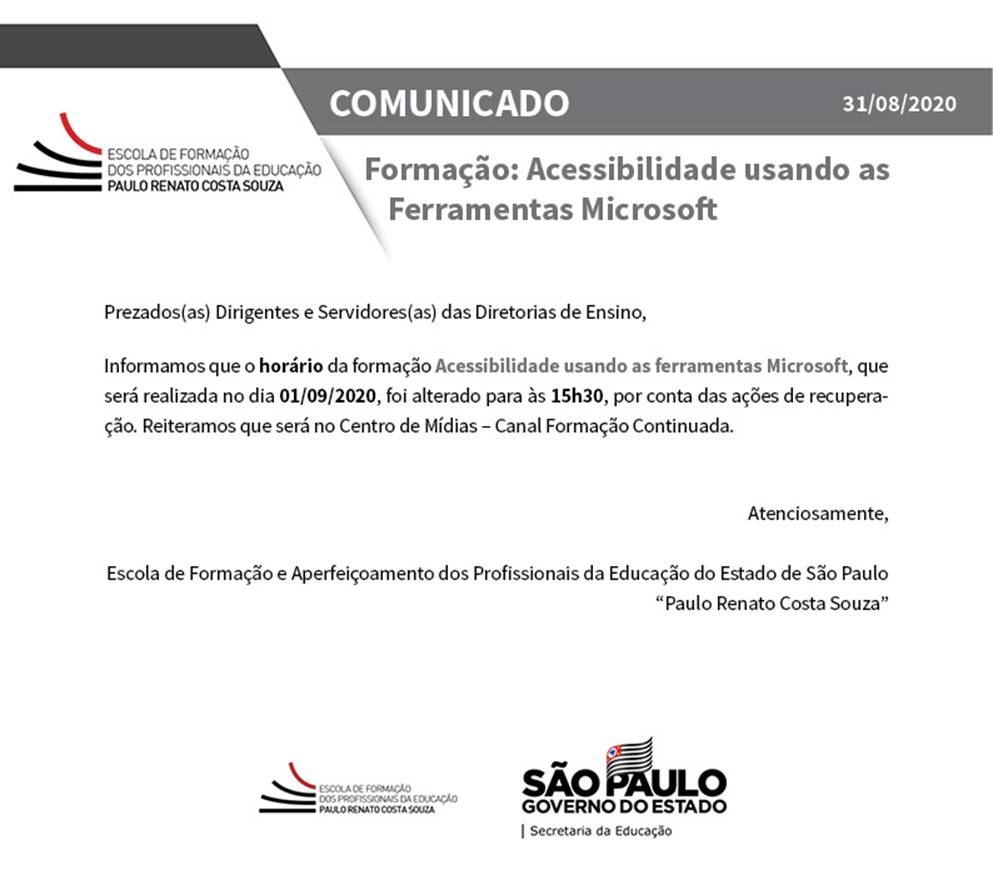 BOLETIM 24 – FORMAÇÃO: ACESSIBILIDADE USANDO AS FERRAMENTAS MICROSOFT – ALTERAÇÃO DE HORÁRIO. 31-08-207 de outubro de 2020 Enviar por e-mail Clique no link para visualizar o boletim EFAPE nº 24/2020: https://seesp-my.sharepoint.com/personal/dectrnit_educacao_sp_gov_br/_layouts/15/guestaccess.aspx?docid=096434a66259f4d5b8f5b3104cbbb2186&authkey=AcKZuX1bgDAkuidxMbEqKgY&e=1zKRq8 NPE DER CTR. LEIA TAMBÉM EDITAL CGP, DE 04 DE FEVEREIRO DE 2026 – E.E PADR ANTONIO VIEIRA. EDITAL DE ENTREVISTAS PARA PROFESSOR EDUCAÇÃO BÁSICA II/ PROFESSOR DE ENSINO FUNDAMENTAL E MÉDIO PARA CREDENCIAMENTO NO PEI EM 2026. EDITAL Nº 01/2026 PARA PROCESSO SELETIVO DE DOCENTES PARA O PROGRAMA PROFESSOR TUTOR ANOS INICIAIS 2026. EDITAL – VAGA DE COORDENAÇÃO DE GESTÃO PEDAGÓGICA ANOS INICIAIS – EF – EE DAILY RESENDE FRANÇA PROFESSOR, DE 29 DE JANEIRO DE 2026.