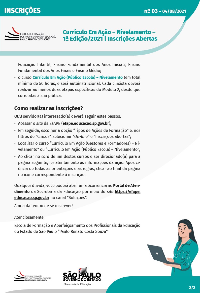 BOLETIM 3 – CURRÍCULO EM AÇÃO – NIVELAMENTO – 1ª EDIÇÃO/2021 | INSCRIÇÕES ABERTAS. 04-08-21 Enviar por e-mail NPE DER CTR. LEIA TAMBÉM EDITAL DE ENTREVISTAS PARA PROFESSOR EDUCAÇÃO BÁSICA II/ PROFESSOR DE ENSINO FUNDAMENTAL E MÉDIO PARA CREDENCIAMENTO NO PEI EM 2026. EDITAL Nº 01/2026 PARA PROCESSO SELETIVO DE DOCENTES PARA O PROGRAMA PROFESSOR TUTOR ANOS INICIAIS 2026. EDITAL – VAGA DE COORDENAÇÃO DE GESTÃO PEDAGÓGICA ANOS INICIAIS – EF – EE DAILY RESENDE FRANÇA PROFESSOR, DE 29 DE JANEIRO DE 2026. ATENÇÃO! INSCRIÇÕES ABERTAS PARA AS AULAS OLÍMPICAS 2026!