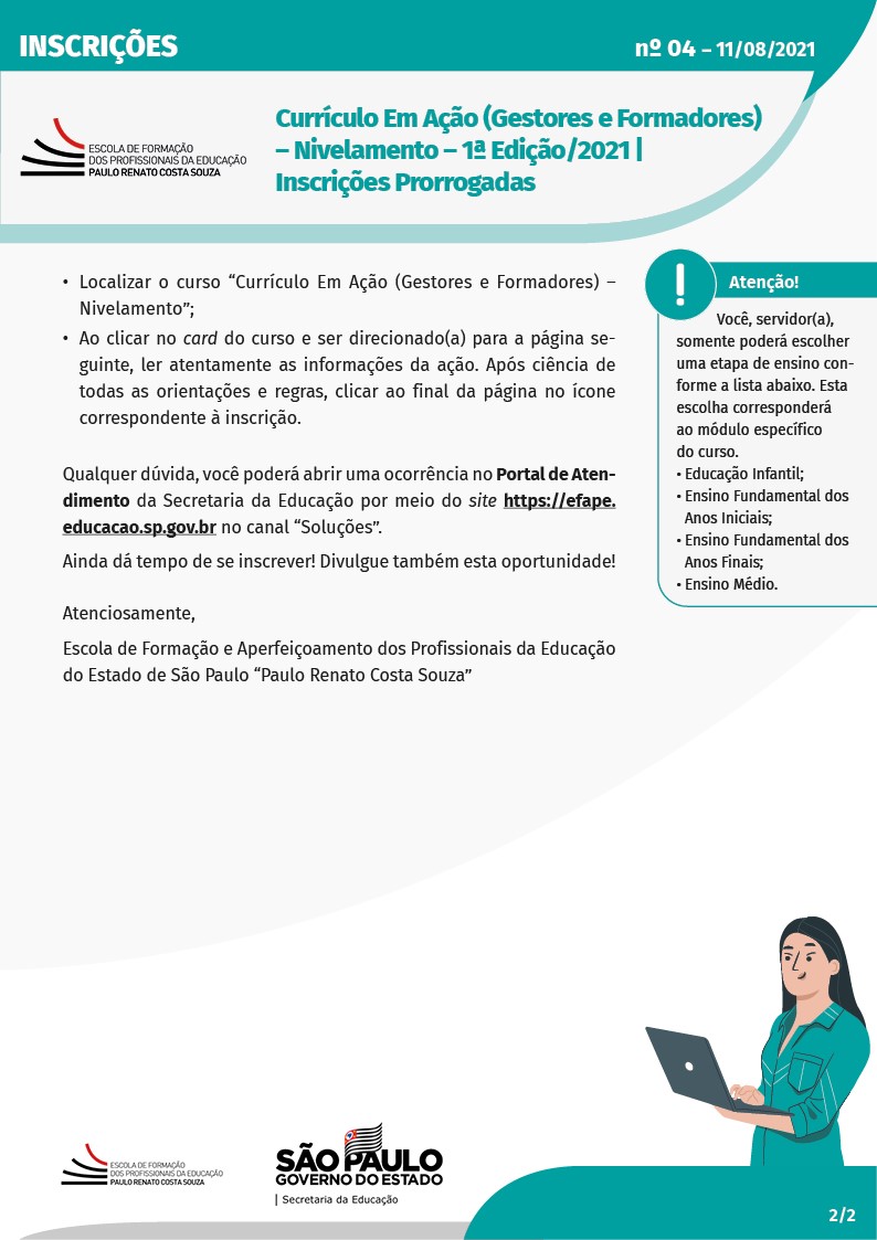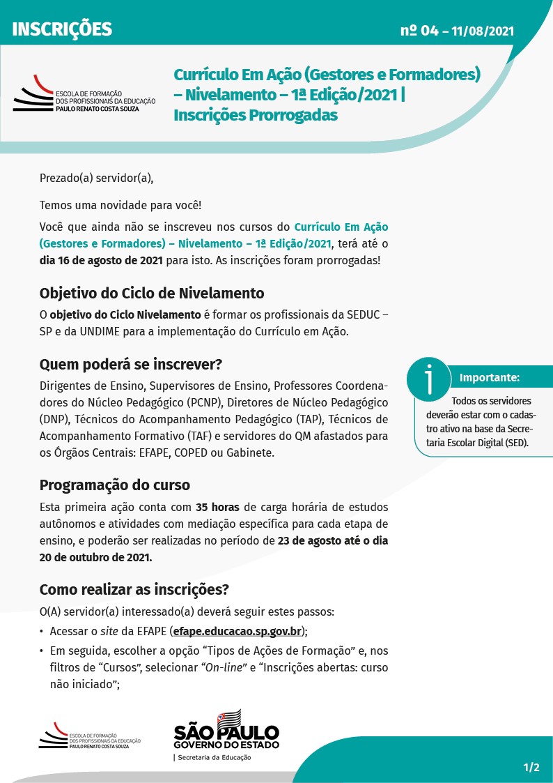 BOLETIM 4 – CURRÍCULO EM AÇÃO (GESTORES E FORMADORES) – NIVELAMENTO – 1ª EDIÇÃO/2021 | INSCRIÇÕES PRORROGADAS. 12-08-21 Enviar por e-mail NPE DER CTR. LEIA TAMBÉM EDITAL PARA O PREENCHIMENTO DE VAGA DE PROFESSOR DO CENTRO DE INOVAÇÃO DA EDUCAÇÃO BÁSICA PAULISTA (CIEBP) – UNIDADE REGIONAL DE ENSINO REGIÃO CENTRO – VINCULADO À EE PROFESSORA ZULEIKA DE BARROS MARTINS FERREIRA. EDITAL PROFESSOR DO PROJETO DE APOIO AO PROTAGONISMO ESTUDANTIL. EDITAL 01/2026 – PROCESSO SELETIVO PARA ATRIBUIÇÃO DE AULAS DE PROFESSOR ORIENTADOR DE CONVIVÊNCIA – POC – UNIDADE REGIONAL DE ENSINO CENTRO. EDITAL SALA DE LEITURA, DE 29 DE JANEIRO DE 2026