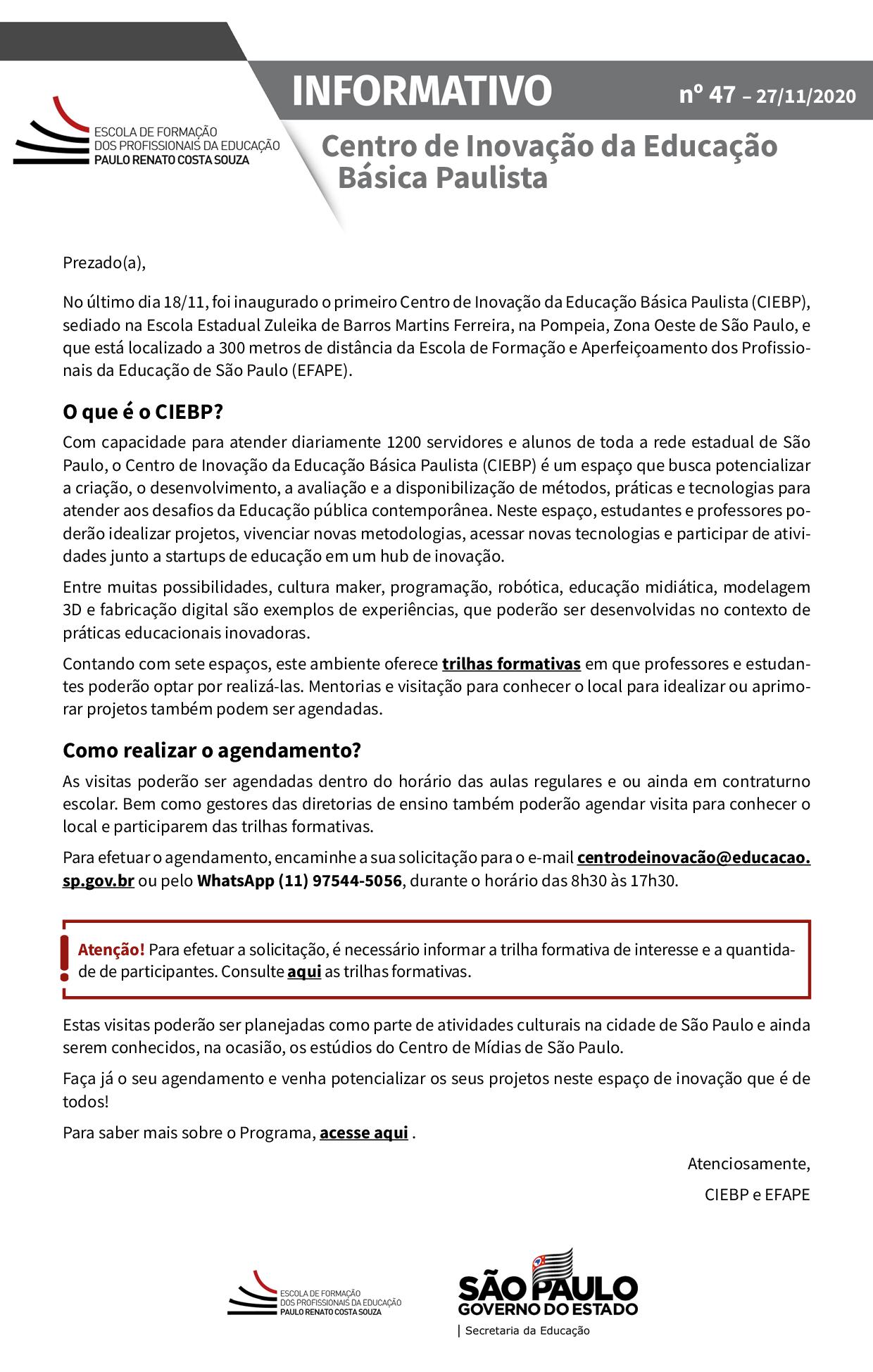 BOLETIM 47 | CENTRO DE INOVAÇÃO DA EDUCAÇÃO BÁSICA PAULISTA. 30-11-204 de dezembro de 2020 Enviar por e-mail LEIA TAMBÉM RESULTADO DAS ENTREVISTAS PARA DESIGNAÇÃO DE DIRETOR ESCOLAR NOS TERMOS DA RESOLUÇÃO 28/2023 – EDITAL 29/2025 (EE PAULO SETÚBAL). EDITAL DE ENTREVISTAS PARA PROFESSOR – PEI. CLASSIFICAÇÃO INICIAL – PROFESSOR TUTOR. CONVITE DOS ESTUDANTES ELEGÍVEIS À EDUCAÇÃO ESPECIAL – ARTE SEM BARREIRAS! – EE ZULEIKA DE BARROS MARTINS FERREIRA.