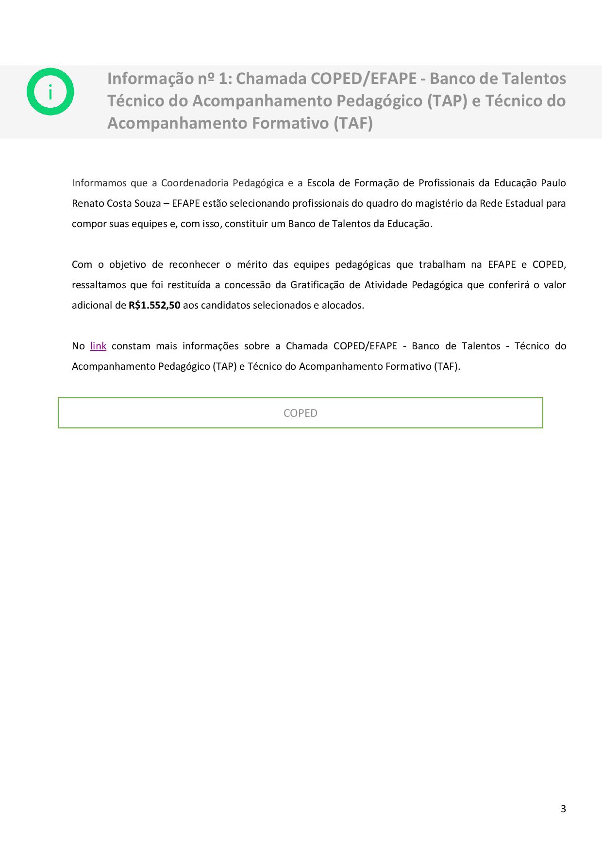 BOLETIM COPED EXTRAORDINÁRIO 2020. 10-11-204 de dezembro de 2020 Enviar por e-mail LEIA TAMBÉM EDITAL PARA O PREENCHIMENTO DE VAGA DE PROFESSOR DO CENTRO DE INOVAÇÃO DA EDUCAÇÃO BÁSICA PAULISTA (CIEBP) – UNIDADE REGIONAL DE ENSINO REGIÃO CENTRO – VINCULADO À EE PROFESSORA ZULEIKA DE BARROS MARTINS FERREIRA. EDITAL PROFESSOR DO PROJETO DE APOIO AO PROTAGONISMO ESTUDANTIL. EDITAL 01/2026 – PROCESSO SELETIVO PARA ATRIBUIÇÃO DE AULAS DE PROFESSOR ORIENTADOR DE CONVIVÊNCIA – POC – UNIDADE REGIONAL DE ENSINO CENTRO. EDITAL SALA DE LEITURA, DE 29 DE JANEIRO DE 2026