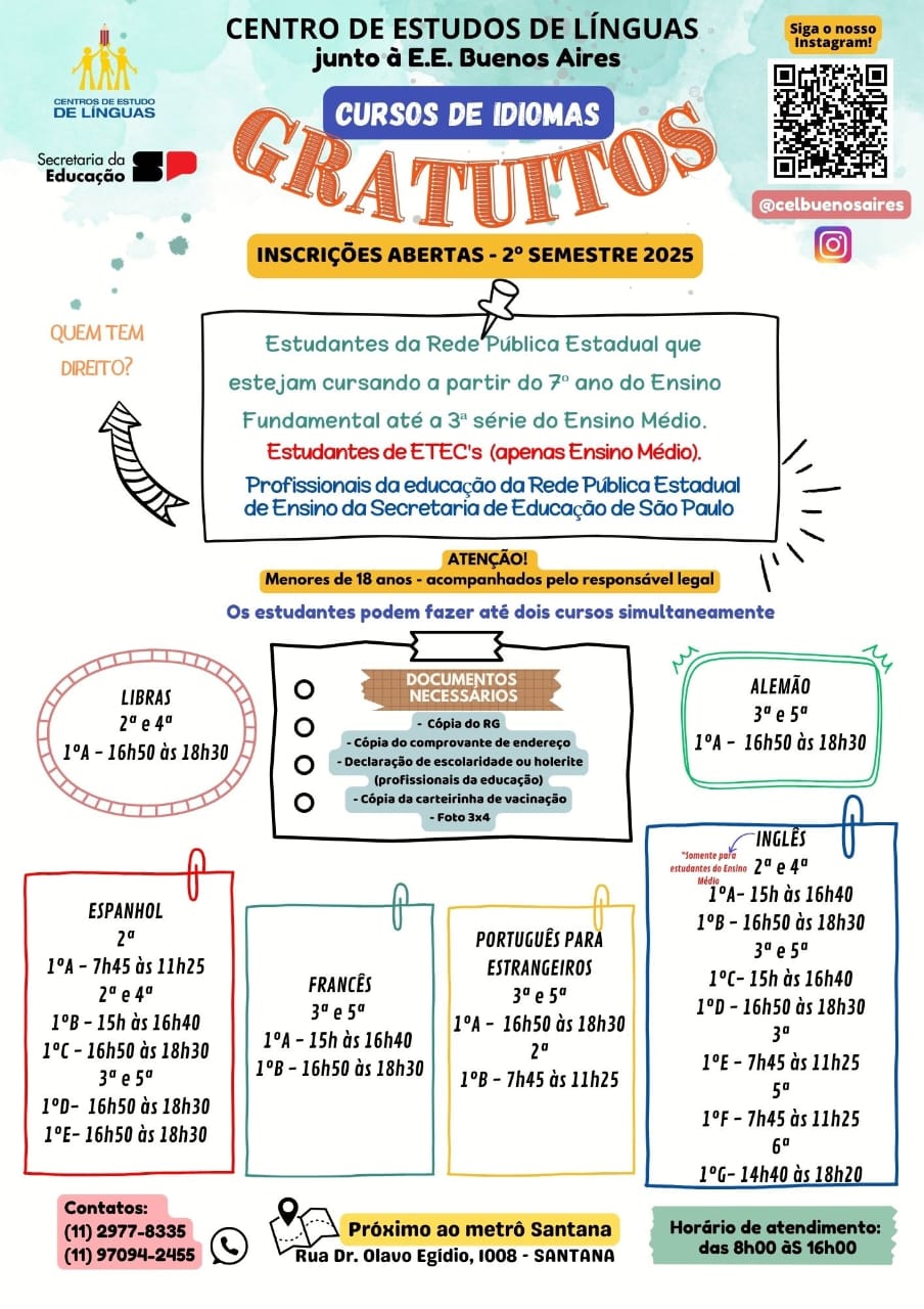 CENTRO DE ESTUDOS DE LÍNGUAS – INSCRIÇÕES ABERTAS – EE BUENOS AIRES – 2025. 09-06-2511 de junho de 2025 Enviar por e-mail LEIA TAMBÉM RESULTADO DAS ENTREVISTAS PARA DESIGNAÇÃO DE DIRETOR ESCOLAR NOS TERMOS DA RESOLUÇÃO 28/2023 – EDITAL 29/2025 (EE PAULO SETÚBAL). EDITAL DE ENTREVISTAS PARA PROFESSOR – PEI. CLASSIFICAÇÃO INICIAL – PROFESSOR TUTOR. CONVITE DOS ESTUDANTES ELEGÍVEIS À EDUCAÇÃO ESPECIAL – ARTE SEM BARREIRAS! – EE ZULEIKA DE BARROS MARTINS FERREIRA.
