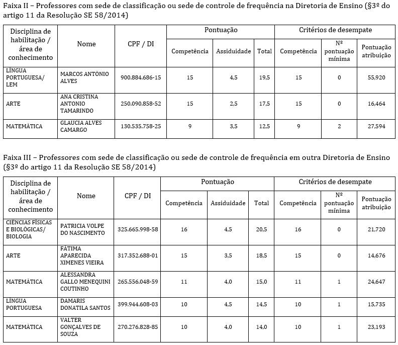O Dirigente Regional de Ensino da Diretoria de Ensino Região Centro torna pública a classificação dos candidatos avaliados e indicados para professor em atividade docente de Biologia, Física, Português/Inglês, Sala de Leitura (professor readaptado) na EE Buenos Aires; Física, Português, Português / Inglês na EE Casimiro de Abreu; Português/Inglês, Arte, Sala de Leitura (professor readaptado) na EE Dulce Ferreira Boarin, Prof.; Matemática, Arte na EE Frontino Guimarães; Inglês, Sala de Leitura (professor readaptado) na EE Homem de Mello, Barão; Matemática na EE Mauro de Oliveira, Prof.; Inglês na EE Orlando Horácio Vita, Prof.; Sala de Leitura (professor readaptado) na EE de São Paulo.