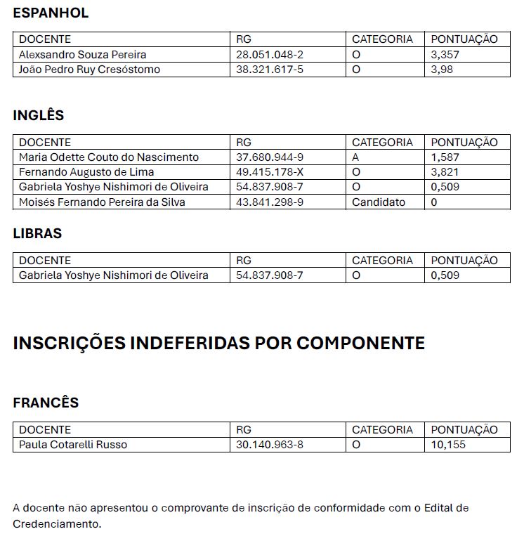 CLASSIFICAÇÃO FINAL – CENTRO DE ESTUDO DE LÍNGUAS – CEL JTO À EE. PROF. MAURO DE OLIVEIRA. 24-02-2527 de fevereiro de 2025 Enviar por e-mail LEIA TAMBÉM RESULTADO DAS ENTREVISTAS PARA DESIGNAÇÃO DE DIRETOR ESCOLAR NOS TERMOS DA RESOLUÇÃO 28/2023 – EDITAL 29/2025 (EE PAULO SETÚBAL). EDITAL DE ENTREVISTAS PARA PROFESSOR – PEI. CLASSIFICAÇÃO INICIAL – PROFESSOR TUTOR. CONVITE DOS ESTUDANTES ELEGÍVEIS À EDUCAÇÃO ESPECIAL – ARTE SEM BARREIRAS! – EE ZULEIKA DE BARROS MARTINS FERREIRA.