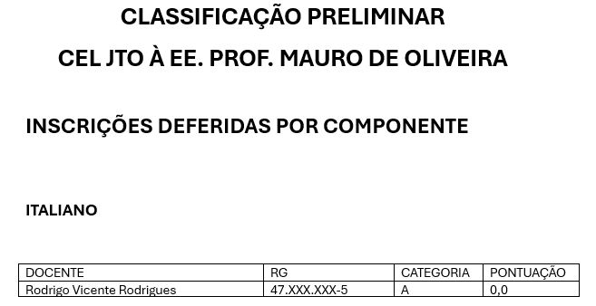 CLASSIFICAÇÃO PRELIMINAR – CEL EE. PROF. MAURO DE OLIVEIRA. 29-07-2531 de julho de 2025 Enviar por e-mail LEIA TAMBÉM RESULTADO DAS ENTREVISTAS PARA DESIGNAÇÃO DE DIRETOR ESCOLAR NOS TERMOS DA RESOLUÇÃO 28/2023 – EDITAL 29/2025 (EE PAULO SETÚBAL). EDITAL DE ENTREVISTAS PARA PROFESSOR – PEI. CLASSIFICAÇÃO INICIAL – PROFESSOR TUTOR. CONVITE DOS ESTUDANTES ELEGÍVEIS À EDUCAÇÃO ESPECIAL – ARTE SEM BARREIRAS! – EE ZULEIKA DE BARROS MARTINS FERREIRA.