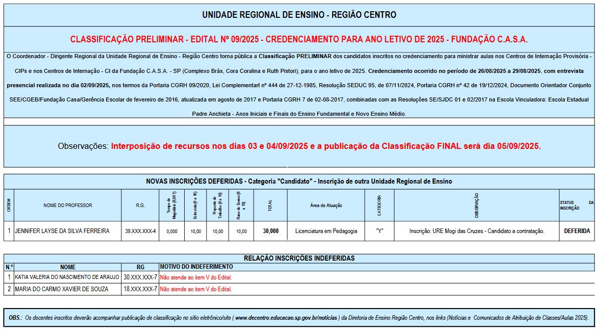 CLASSIFICAÇÃO PRELIMINAR – EDITAL Nº 09/2025 – CREDENCIAMENTO PARA ANO LETIVO DE 2025 – FUNDAÇÃO C.A.S.A. 03-09-254 de setembro de 2025 Enviar por e-mail LEIA TAMBÉM RESULTADO DAS ENTREVISTAS PARA DESIGNAÇÃO DE DIRETOR ESCOLAR NOS TERMOS DA RESOLUÇÃO 28/2023 – EDITAL 29/2025 (EE PAULO SETÚBAL). EDITAL DE ENTREVISTAS PARA PROFESSOR – PEI. CLASSIFICAÇÃO INICIAL – PROFESSOR TUTOR. CONVITE DOS ESTUDANTES ELEGÍVEIS À EDUCAÇÃO ESPECIAL – ARTE SEM BARREIRAS! – EE ZULEIKA DE BARROS MARTINS FERREIRA.