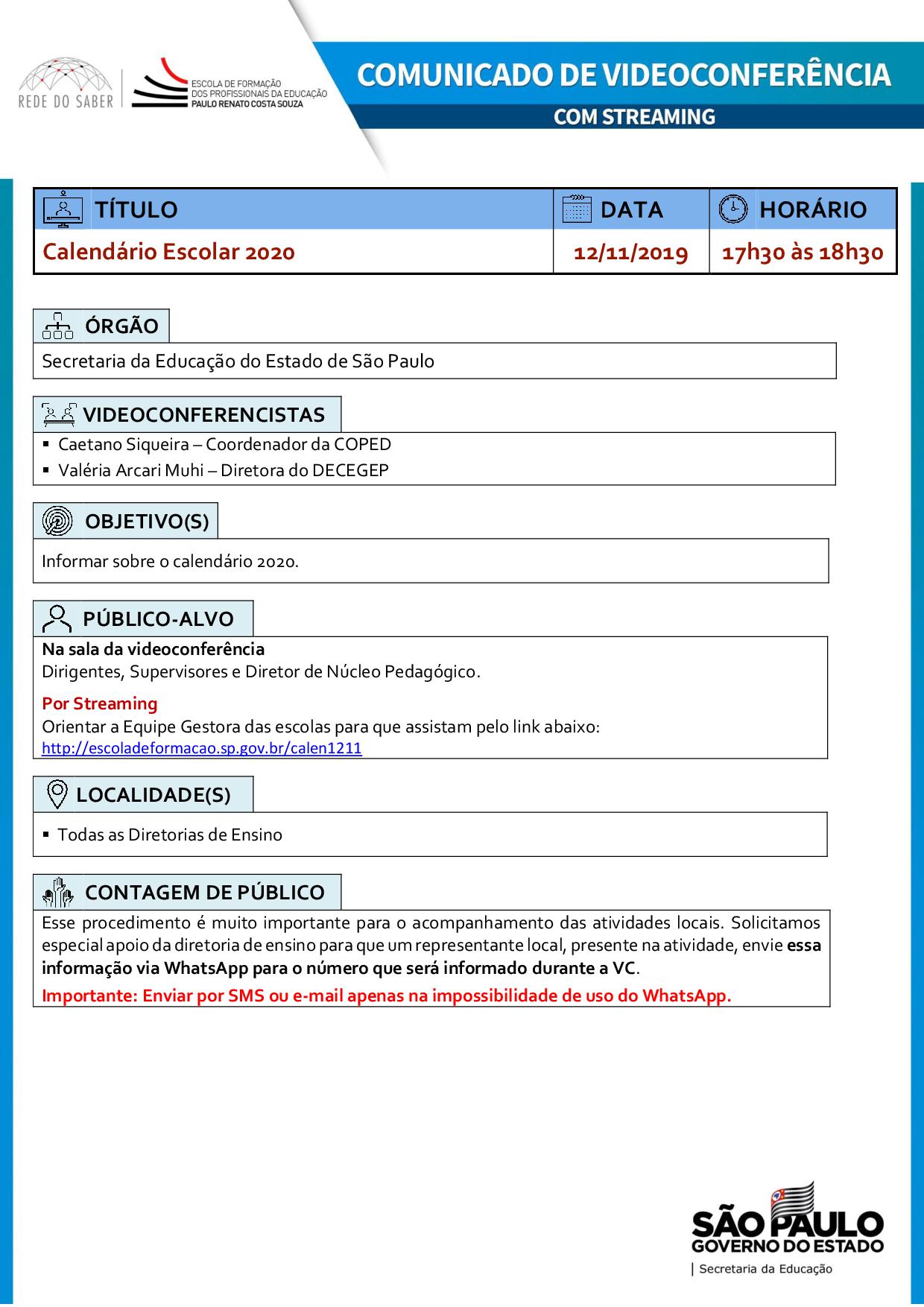 SENHORES DIRETORES – COMUNICADO DE VIDEOCONFERÊNCIA – CALENDÁRIO ESCOLAR 2020. 12-11-1913 de novembro de 2019 Enviar por e-mail LEIA TAMBÉM PROCESSO SELETIVO SIMPLIFICADO PARA AFASTAMENTO JUNTO À ASSISTENCIA TÉCNICA URE CENTRO. DEFERIMENTO DAS INSCRIÇÕES PARA DESIGNAÇÃO DE DIRETOR DE ESCOLA NOS TERMOS DA RESOLUÇÃO 41/2023 – EDITAL 04/2026 (EE GONÇALVES DIAS) EDITAIS DE ABERTURA DE INSCRIÇÕES PARA AGENTE DE ORGANIZAÇÃO ESCOLAR – FEV. 2026. EDITAL 02/2026 DOS DOCENTES DEFERIDOS/ INDEFERIDOS DO PROCESSO SELETIVO INICIAL SIMPLIFICADO PARA ATUAR NO CURSO DE PRESENÇA FLEXÍVEL.