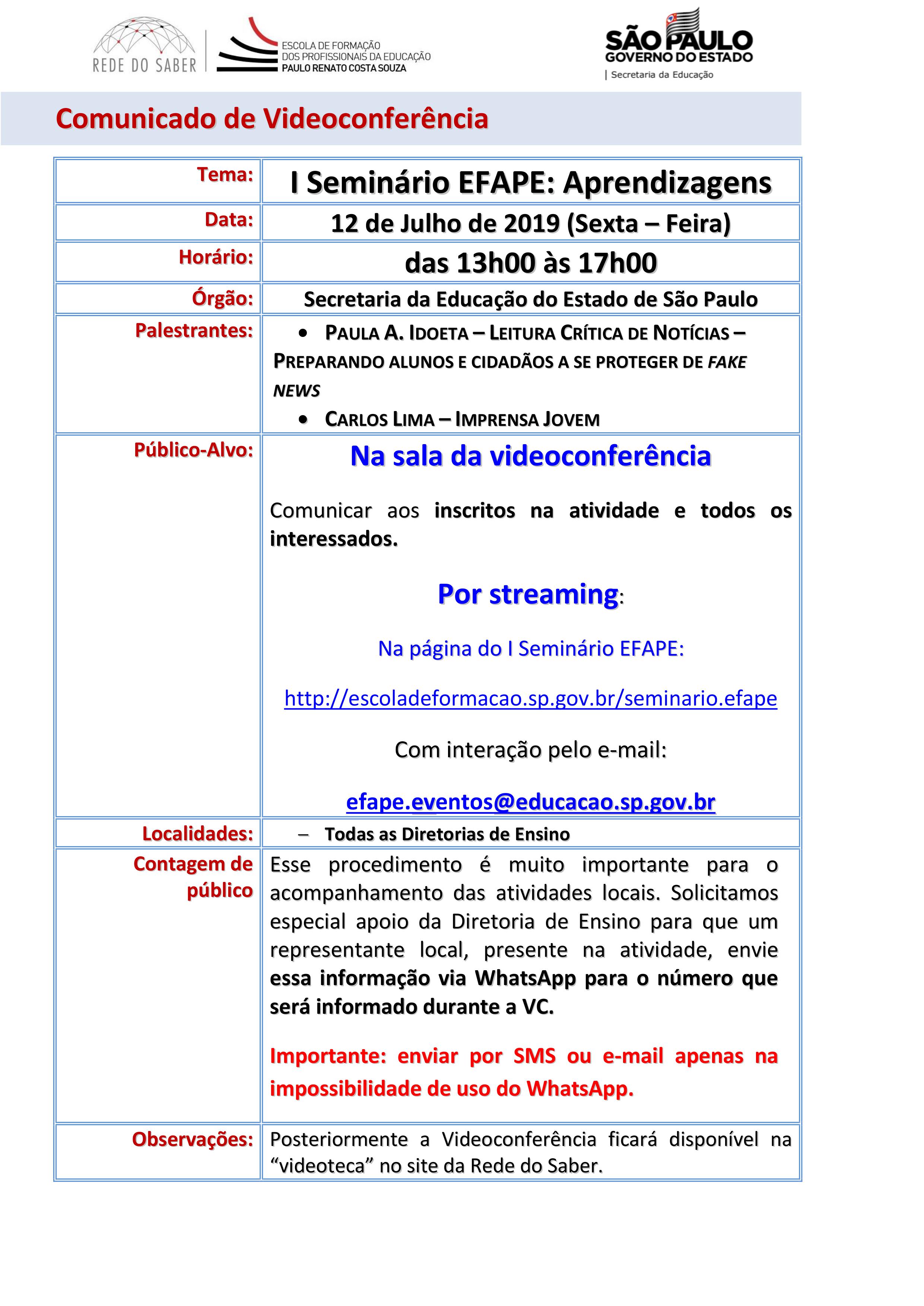 COMUNICADO DE VIDEOCONFERÊNCIA – STREAMING – I SEMINÁRIO EFAPE: APRENDIZAGENS. 12-07-19 Enviar por e-mail LEIA TAMBÉM EDITAL PARA O PREENCHIMENTO DE VAGA DE PROFESSOR DO CENTRO DE INOVAÇÃO DA EDUCAÇÃO BÁSICA PAULISTA (CIEBP) – UNIDADE REGIONAL DE ENSINO REGIÃO CENTRO – VINCULADO À EE PROFESSORA ZULEIKA DE BARROS MARTINS FERREIRA. EDITAL PROFESSOR DO PROJETO DE APOIO AO PROTAGONISMO ESTUDANTIL. EDITAL 01/2026 – PROCESSO SELETIVO PARA ATRIBUIÇÃO DE AULAS DE PROFESSOR ORIENTADOR DE CONVIVÊNCIA – POC – UNIDADE REGIONAL DE ENSINO CENTRO. EDITAL SALA DE LEITURA, DE 29 DE JANEIRO DE 2026