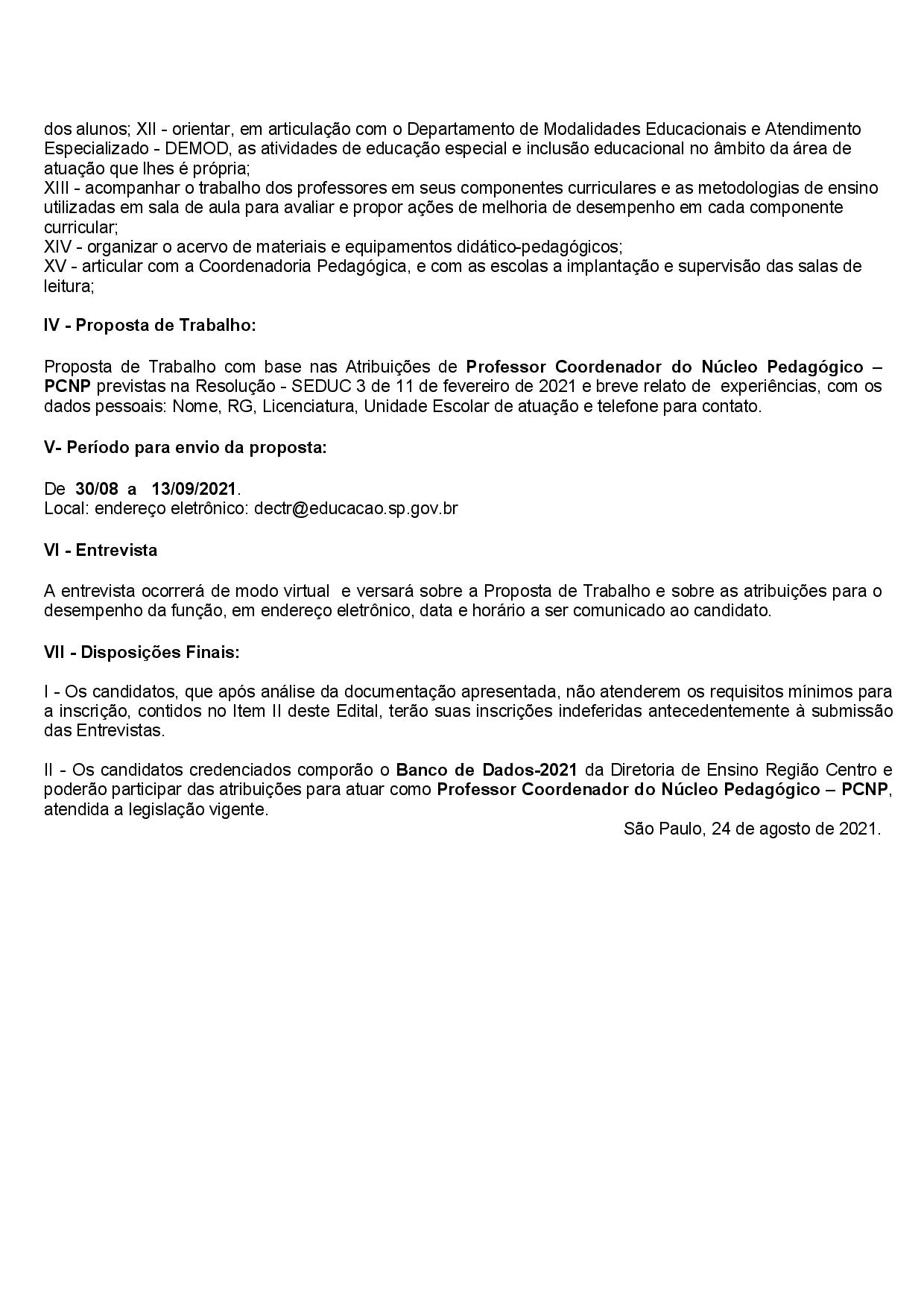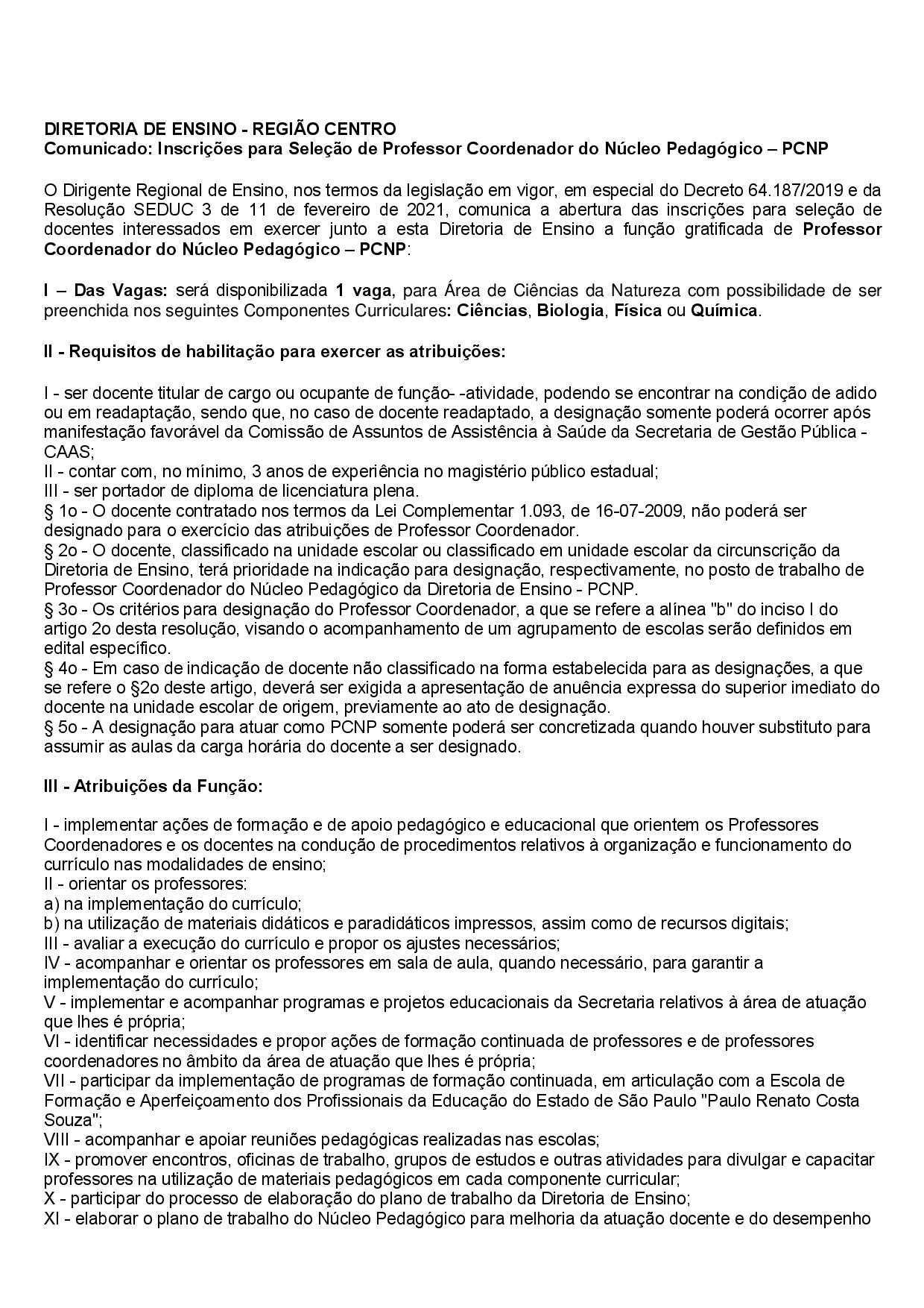 COMUNICADO: INSCRIÇÕES PARA SELEÇÃO DE PROFESSOR COORDENADOR DO NÚCLEO PEDAGÓGICO – PCNP. 24-08-21 Enviar por e-mail LEIA TAMBÉM EDITAL PARA O PREENCHIMENTO DE VAGA DE PROFESSOR DO CENTRO DE INOVAÇÃO DA EDUCAÇÃO BÁSICA PAULISTA (CIEBP) – UNIDADE REGIONAL DE ENSINO REGIÃO CENTRO – VINCULADO À EE PROFESSORA ZULEIKA DE BARROS MARTINS FERREIRA. EDITAL PROFESSOR DO PROJETO DE APOIO AO PROTAGONISMO ESTUDANTIL. EDITAL 01/2026 – PROCESSO SELETIVO PARA ATRIBUIÇÃO DE AULAS DE PROFESSOR ORIENTADOR DE CONVIVÊNCIA – POC – UNIDADE REGIONAL DE ENSINO CENTRO. EDITAL SALA DE LEITURA, DE 29 DE JANEIRO DE 2026