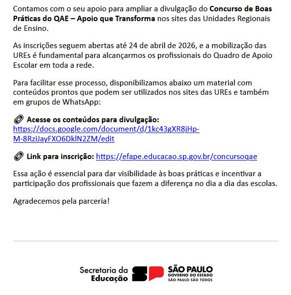 CONCURSO DE BOAS PRÁTICAS QAE. 15-04-2615 de abril de 2026 Enviar por e-mail LEIA TAMBÉM EDITAIS DE ABERTURA DE INSCRIÇÃO PARA AGENTE DE ORGANIZAÇÃO ESCOLAR – ABRIL 2026. EDITAL Nº 01/2026 – GERENTE DE ORGANIZAÇÃO ESCOLAR, DE 14/04/2026 EDITAL 04/2026 – VICE DIRETOR, DE 14 DE ABRIL DE 2026 – EE AFRÂNIO PEIXOTO – EE PADRE ANTONIO VIEIRA. INFORMAÇÃO – INSCRIÇÃO DE REMANESCENTE OU PSS 2026.