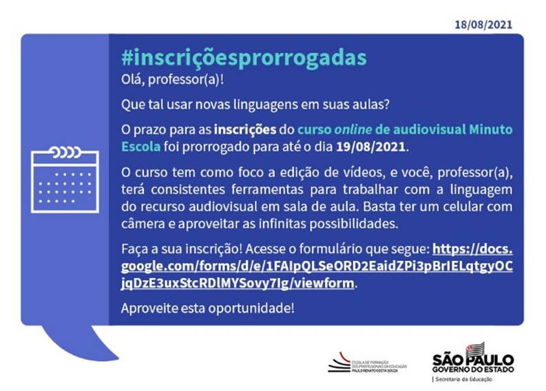 CURSO ONLINE DE AUDIOVISUAL MINUTO ESCOLA – INSCRIÇÕES PRORROGADAS. 19-08-21 Enviar por e-mail NPE DER CTR. LEIA TAMBÉM EDITAL PARA O PREENCHIMENTO DE VAGA DE PROFESSOR DO CENTRO DE INOVAÇÃO DA EDUCAÇÃO BÁSICA PAULISTA (CIEBP) – UNIDADE REGIONAL DE ENSINO REGIÃO CENTRO – VINCULADO À EE PROFESSORA ZULEIKA DE BARROS MARTINS FERREIRA. EDITAL PROFESSOR DO PROJETO DE APOIO AO PROTAGONISMO ESTUDANTIL. EDITAL 01/2026 – PROCESSO SELETIVO PARA ATRIBUIÇÃO DE AULAS DE PROFESSOR ORIENTADOR DE CONVIVÊNCIA – POC – UNIDADE REGIONAL DE ENSINO CENTRO. EDITAL SALA DE LEITURA, DE 29 DE JANEIRO DE 2026