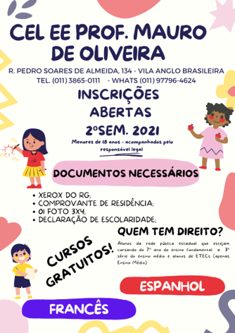 CURSOS DE IDIOMAS GRATUITOS – CEL E.E BUENOS AIRES E CEL E.E PROF. MAURO DE OLIVEIRA 14-07-21 Enviar por e-mail LEIA TAMBÉM EDITAL DE CONVOCAÇÃO ALOCAÇÃO de DOCENTES EXCEDENTES DE MÓDULO (EFETIVOS e NÃO EFETIVOS – “F”) EDITAL PARA DESIGNAÇÃO DE COORDENADOR DE GESTÃO PEDAGÓGICA NA EE ORESTES GUIMARÃES- UNIDADE REGIONAL DE ENSINO – CENTRO. RESULTADO DA ENTREVISTA PARA DESIGNAÇÃO DE DIRETOR ESCOLAR NOS TERMOS DA RESOLUÇÃO 28/2023 – EDITAL 30/2025 (EE JOAQUIM LEME DO PRADO). EDITAL DE ENTREVISTAS PARA PROFESSOR – REALOCAÇÃO.