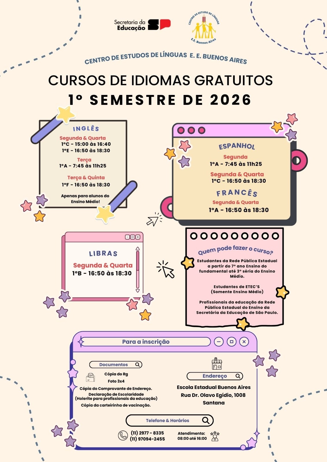 CURSOS DE IDIOMAS GRATUITOS – CENTRO DE ESTUDOS DE LÍNGUAS – EE BUENOS AIRES. 04-02-26 Enviar por e-mail LEIA TAMBÉM EDITAL Nº 01/2026 – CREDENCIAMENTO PARA FUNDAÇÃO C.A.S.A. – FEVEREIRO/2026. INSCREVA-SE NAS AULAS OLÍMPICAS 2026. EDITAL CGP, DE 04 DE FEVEREIRO DE 2026 – E.E PADR ANTONIO VIEIRA. EDITAL DE ENTREVISTAS PARA PROFESSOR EDUCAÇÃO BÁSICA II/ PROFESSOR DE ENSINO FUNDAMENTAL E MÉDIO PARA CREDENCIAMENTO NO PEI EM 2026.