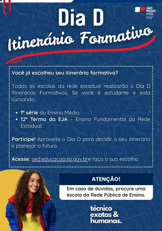 DIA D – ITINERÁRIO FORMATIVO. 16-09-259 de outubro de 2025 Enviar por e-mail LEIA TAMBÉM RESULTADO DAS ENTREVISTAS PARA DESIGNAÇÃO DE DIRETOR ESCOLAR NOS TERMOS DA RESOLUÇÃO 28/2023 – EDITAL 29/2025 (EE PAULO SETÚBAL). EDITAL DE ENTREVISTAS PARA PROFESSOR – PEI. CLASSIFICAÇÃO INICIAL – PROFESSOR TUTOR. CONVITE DOS ESTUDANTES ELEGÍVEIS À EDUCAÇÃO ESPECIAL – ARTE SEM BARREIRAS! – EE ZULEIKA DE BARROS MARTINS FERREIRA.