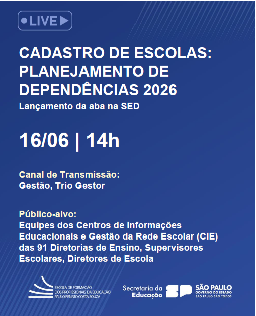 DIRETORES DE ESCOLA/ESCOLARES – LIVE CADASTRO DE ESCOLAS: PLANEJAMENTO DE DEPENDÊNCIAS 2026. 16-06-2516 de junho de 2025 Enviar por e-mail YouTube: https://youtube.com/live/9C8sPnazWq8?feature=share LEIA TAMBÉM RESULTADO DAS ENTREVISTAS PARA DESIGNAÇÃO DE DIRETOR ESCOLAR NOS TERMOS DA RESOLUÇÃO 28/2023 – EDITAL 29/2025 (EE PAULO SETÚBAL). EDITAL DE ENTREVISTAS PARA PROFESSOR – PEI. CLASSIFICAÇÃO INICIAL – PROFESSOR TUTOR. CONVITE DOS ESTUDANTES ELEGÍVEIS À EDUCAÇÃO ESPECIAL – ARTE SEM BARREIRAS! – EE ZULEIKA DE BARROS MARTINS FERREIRA.
