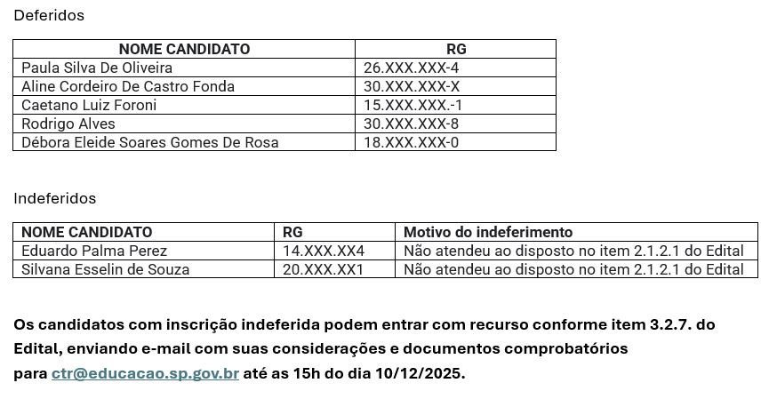 O Coordenador Dirigente Regional de Ensino Região Centro torna pública a relação de candidatos que tiveram sua inscrição deferida ou indeferida, de acordo com o disposto no Edital 30/2025 publicado no Diário Oficial do Estado em 01/12/2025, Sec 3.