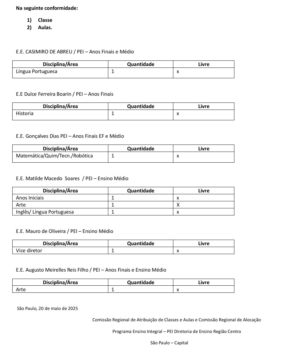 A Dirigente Regional de Ensino da Diretoria de Ensino Centro/SP, no uso de sua competência, CONVOCA para a sessão de alocação do Programa Ensino Integral – PEI 2025, aos docentes Categoria A, F, Contratados e Candidatos à Contração, remanescentes do concurso VUNESP 2023 ou classificados no Processo Seletivo Simplificado VUNESP/2024 e Docentes do Cadastro Emergencial devidamente inscritos no Processo de Atribuição de Classes e Aulas e devidamente credenciados e entrevistados no Programa Ensino Integral – 2025. Como também, torna pública a relação das vagas das Unidades Escolares a serem ofertadas na sessão de alocação, conforme previstos no Decreto nº 66.799, de 31-05-2022, Resolução SEDUC 93, de 07 de novembro de 2024 e Portaria CGRH 42 de 19 de dezembro de 2024 de que estabelece datas e procedimentos para o Processo de Atribuição Inicial de Classes e Aulas para o ano de 2025, para Sessão de alocação no PEI.