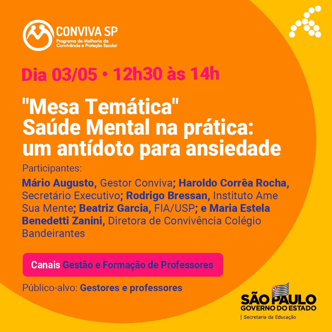 MESA TEMÁTICA – SAÚDE MENTAL NA PRÁTICA: ANTÍDOTO PARA A SOCIEDADE 30-04-21 Enviar por e-mail LEIA TAMBÉM RETIFICAÇÃO – RESULTADO DAS INSCRIÇÕES – EDITAL Nº 01/2026 – CREDENCIAMENTO PARA ANO LETIVO DE 2026 – FUNDAÇÃO C.A.S.A. EDITAL DE CONVOCAÇÃO ALOCAÇÃO PEI – 2026 CONFORME COMUNICADO COMOB/DAA N° 11, de 30/01/2026 3ª CHAMADA – PARA ATENDIMENTO DAS VAGAS REMANESCENTES. ESTÃO ABERTAS AS INSCRIÇÕES PARA MINISTRAR AULAS DE CURSO TÉCNICO DA SEDUC – SP! EDITAL VAGA DE COORDENADOR DE GESTÃO PEDAGÓGICA – ANOS FINAIS E ENSINO MÉDIO – EE TARCÍSIO ÁLVARES LOBO, DE 10 DE FEVEREIRO DE 2026.