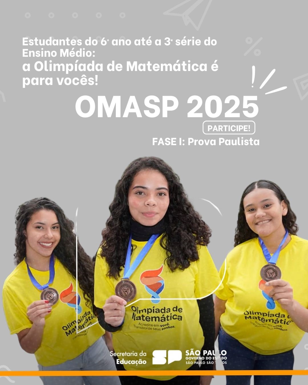 Público: participarão da FASE I da Olimpíada de Matemática das Escolas Estaduais de São Paulo os estudantes dos Anos Finais do Ensino Fundamental (6º, 7º, 8º e 9º anos) e do Ensino Médio (1ª, 2ª e 3ª séries) que realizarem a Prova Paulista do 1º Bimestre de 2025.