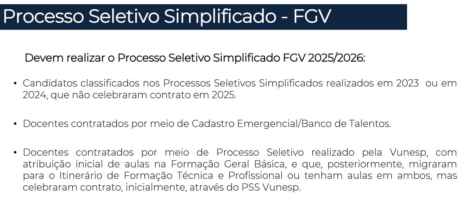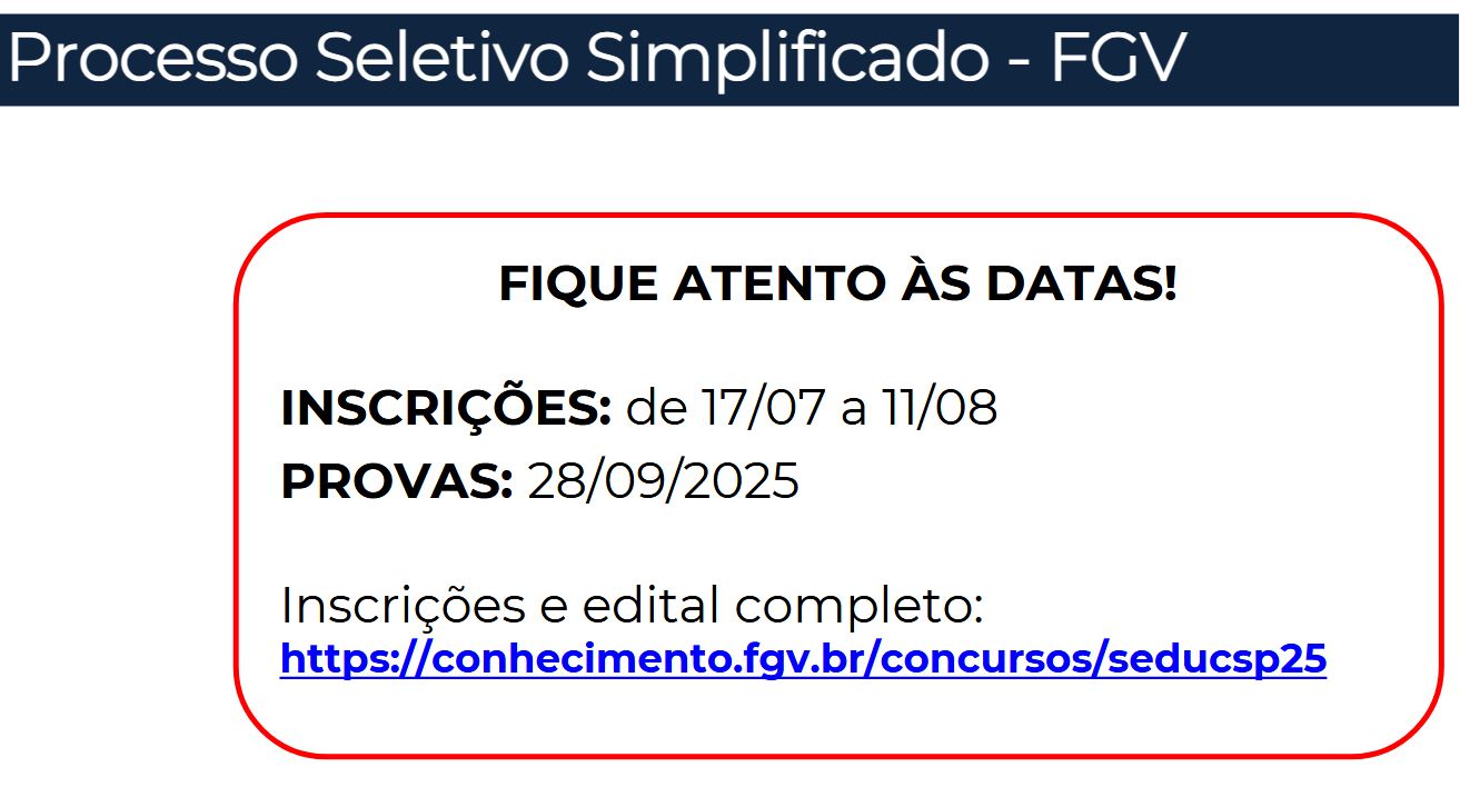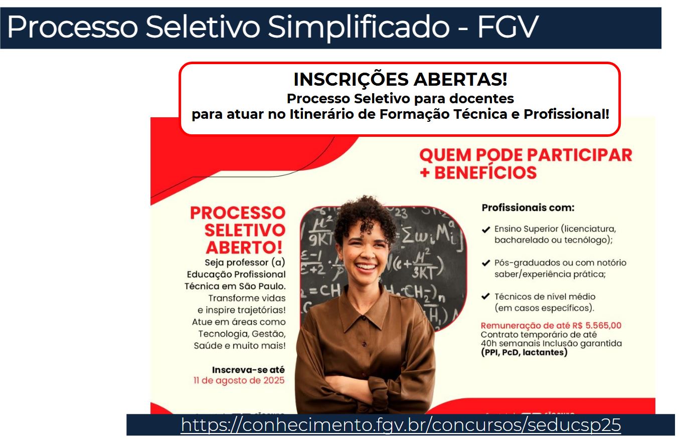 PROCESSO SELETIVO SIMPLIFICADO PARA CONTRATAÇÃO TEMPORÁRIA DE DOCENTES À EDUCAÇÃO PROFISSIONAL TÉCNICA. 31-07-254 de agosto de 2025 Enviar por e-mail CLIQUE AQUI PARA ACESSAR https://conhecimento.fgv.br/concursos/seducsp25 LEIA TAMBÉM RESULTADO DAS ENTREVISTAS PARA DESIGNAÇÃO DE DIRETOR ESCOLAR NOS TERMOS DA RESOLUÇÃO 28/2023 – EDITAL 29/2025 (EE PAULO SETÚBAL). EDITAL DE ENTREVISTAS PARA PROFESSOR – PEI. CLASSIFICAÇÃO INICIAL – PROFESSOR TUTOR. CONVITE DOS ESTUDANTES ELEGÍVEIS À EDUCAÇÃO ESPECIAL – ARTE SEM BARREIRAS! – EE ZULEIKA DE BARROS MARTINS FERREIRA.