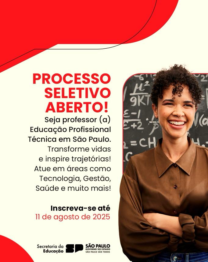 PROCESSSO SELETIVO ABERTO – SEJA PROFESSOR (A) EDUCAÇÃO PROFISSIONAL TÉCNICA EM SÃO PAULO. 07-08-2512 de agosto de 2025 Enviar por e-mail LEIA TAMBÉM RESULTADO DAS ENTREVISTAS PARA DESIGNAÇÃO DE DIRETOR ESCOLAR NOS TERMOS DA RESOLUÇÃO 28/2023 – EDITAL 29/2025 (EE PAULO SETÚBAL). EDITAL DE ENTREVISTAS PARA PROFESSOR – PEI. CLASSIFICAÇÃO INICIAL – PROFESSOR TUTOR. CONVITE DOS ESTUDANTES ELEGÍVEIS À EDUCAÇÃO ESPECIAL – ARTE SEM BARREIRAS! – EE ZULEIKA DE BARROS MARTINS FERREIRA.