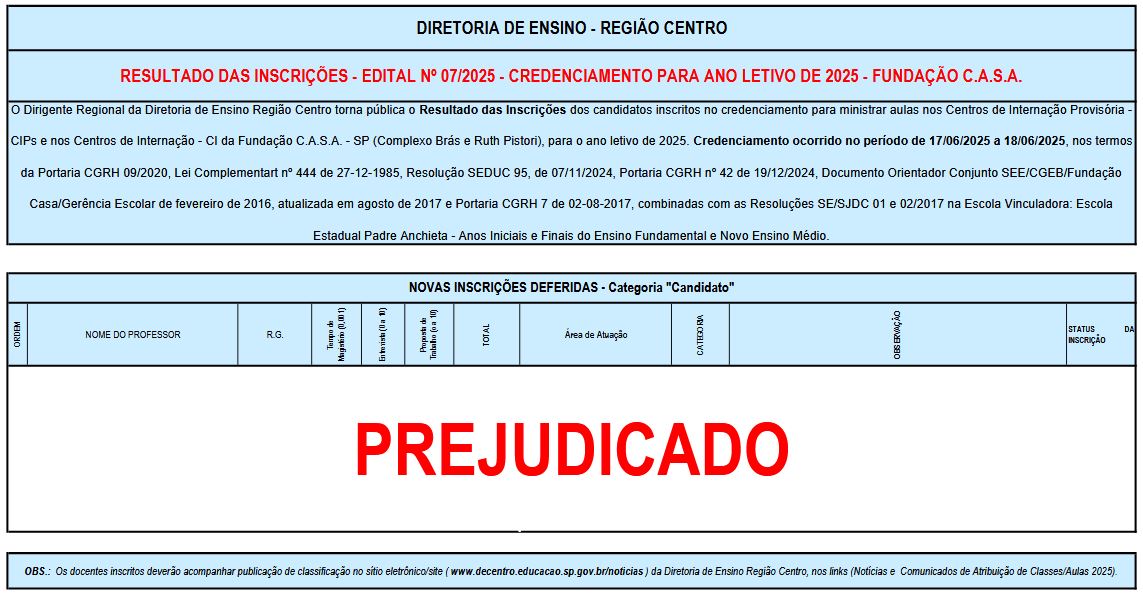 RESULTADO DA INSCRIÇÕES – EDITAL Nº 07/2025 – CREDENCIAMENTO PARA O ANO LETIVO DE 2025, PARA OS DOCENTES INTERESSADOS EM MINISTRAREM AULAS NA FUNDAÇÃO C.A.S.A./SP – COMPLEXO BRÁS E RUTH PISTORI. 23-06-2524 de junho de 2025 Enviar por e-mail LEIA TAMBÉM RESULTADO DAS ENTREVISTAS PARA DESIGNAÇÃO DE DIRETOR ESCOLAR NOS TERMOS DA RESOLUÇÃO 28/2023 – EDITAL 29/2025 (EE PAULO SETÚBAL). EDITAL DE ENTREVISTAS PARA PROFESSOR – PEI. CLASSIFICAÇÃO INICIAL – PROFESSOR TUTOR. CONVITE DOS ESTUDANTES ELEGÍVEIS À EDUCAÇÃO ESPECIAL – ARTE SEM BARREIRAS! – EE ZULEIKA DE BARROS MARTINS FERREIRA.
