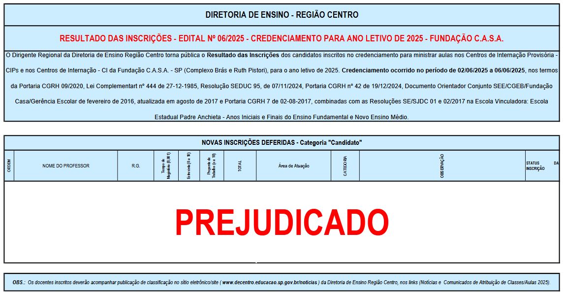 RESULTADO DAS INSCRIÇÕES – EDITAL Nº 06/2025 – CREDENCIAMENTO PARA ANO LETIVO DE 2025 – FUNDAÇÃO C.A.S.A. 09-06-2511 de junho de 2025 Enviar por e-mail LEIA TAMBÉM RESULTADO DAS ENTREVISTAS PARA DESIGNAÇÃO DE DIRETOR ESCOLAR NOS TERMOS DA RESOLUÇÃO 28/2023 – EDITAL 29/2025 (EE PAULO SETÚBAL). EDITAL DE ENTREVISTAS PARA PROFESSOR – PEI. CLASSIFICAÇÃO INICIAL – PROFESSOR TUTOR. CONVITE DOS ESTUDANTES ELEGÍVEIS À EDUCAÇÃO ESPECIAL – ARTE SEM BARREIRAS! – EE ZULEIKA DE BARROS MARTINS FERREIRA.