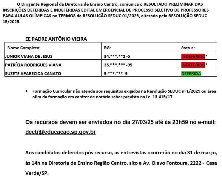 RESULTADO PRELIMINAR DAS INSCRIÇÕES DEFERIDAS E INDEFERIDAS EDITAL EMERGENCIAL DE PROCESSO SELETIVO DE PROFESSORES PARA AULAS OLÍMPICAS NO TERMOS DA RESOLUÇÃO SEDUC 01/2025, ALTERADA PELA RESOLUÇÃO SEDUC 15/2025. 27-03-2531 de março de 2025 Enviar por e-mail Comissão Aulas Olímpicas DE Centro. LEIA TAMBÉM RESULTADO DAS ENTREVISTAS PARA DESIGNAÇÃO DE DIRETOR ESCOLAR NOS TERMOS DA RESOLUÇÃO 28/2023 – EDITAL 29/2025 (EE PAULO SETÚBAL). EDITAL DE ENTREVISTAS PARA PROFESSOR – PEI. CLASSIFICAÇÃO INICIAL – PROFESSOR TUTOR. CONVITE DOS ESTUDANTES ELEGÍVEIS À EDUCAÇÃO ESPECIAL – ARTE SEM BARREIRAS! – EE ZULEIKA DE BARROS MARTINS FERREIRA.