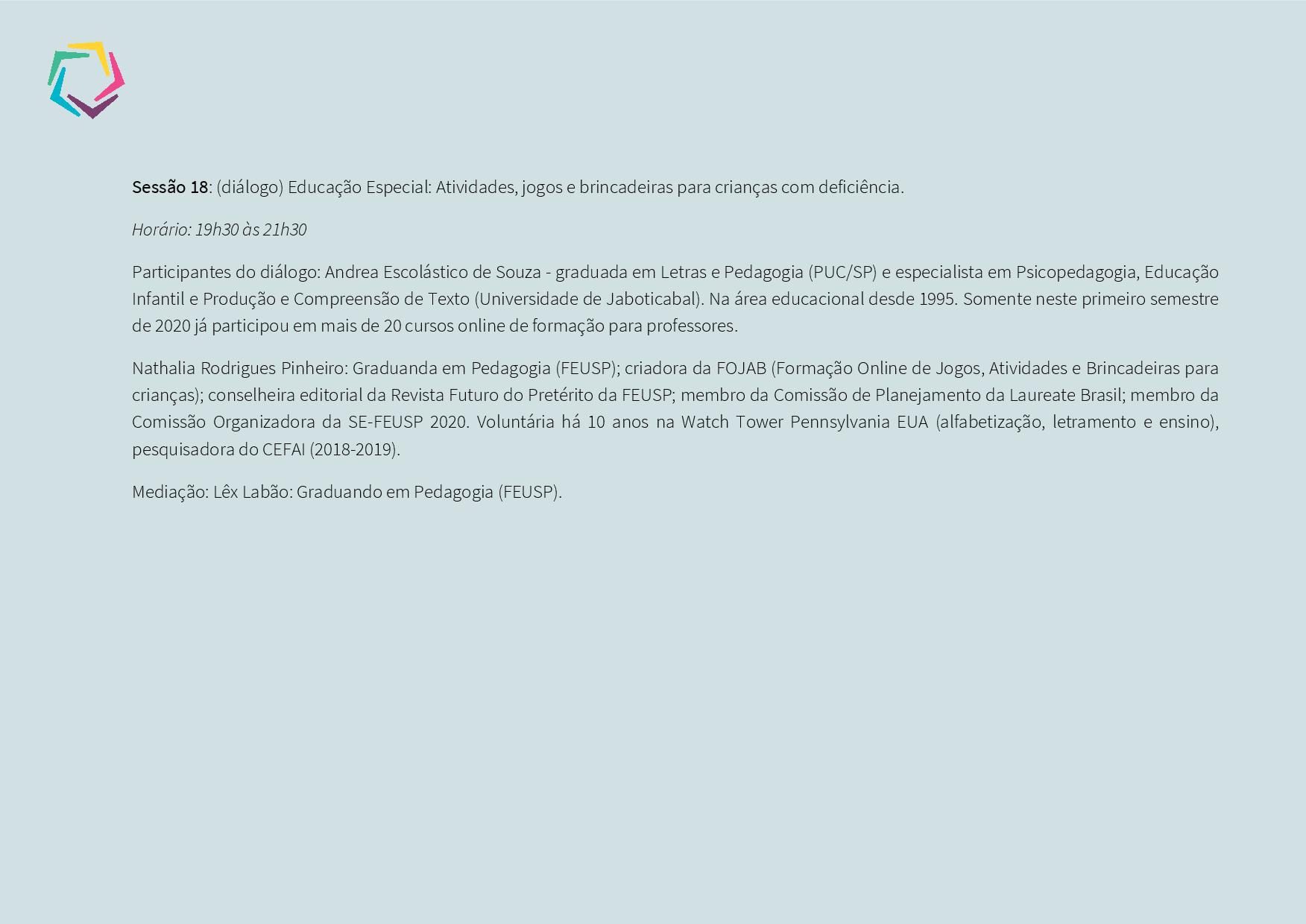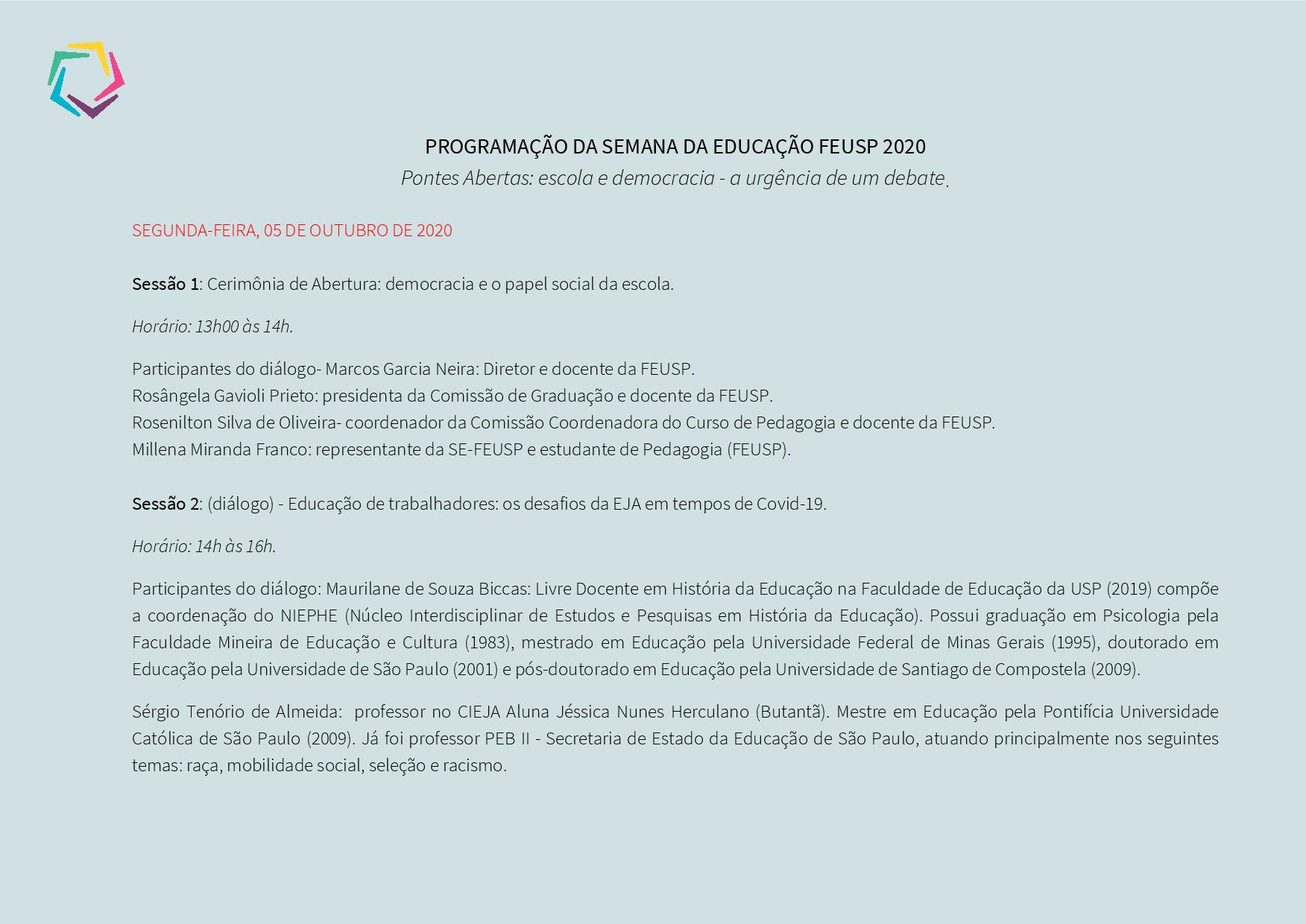 SEMANA DA EDUCAÇÃO FEUSP – 2020 – PROGRAMAÇÃO. 02-10-204 de dezembro de 2020 Enviar por e-mail LEIA TAMBÉM EDITAL PARA O PREENCHIMENTO DE VAGA DE PROFESSOR DO CENTRO DE INOVAÇÃO DA EDUCAÇÃO BÁSICA PAULISTA (CIEBP) – UNIDADE REGIONAL DE ENSINO REGIÃO CENTRO – VINCULADO À EE PROFESSORA ZULEIKA DE BARROS MARTINS FERREIRA. EDITAL PROFESSOR DO PROJETO DE APOIO AO PROTAGONISMO ESTUDANTIL. EDITAL 01/2026 – PROCESSO SELETIVO PARA ATRIBUIÇÃO DE AULAS DE PROFESSOR ORIENTADOR DE CONVIVÊNCIA – POC – UNIDADE REGIONAL DE ENSINO CENTRO. EDITAL SALA DE LEITURA, DE 29 DE JANEIRO DE 2026