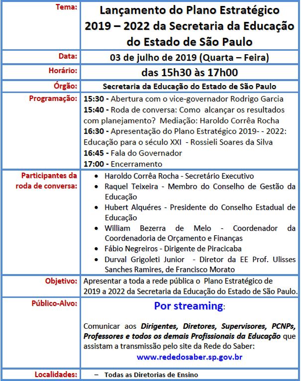 A Dirigente Regional de Ensino CONVOCA os Diretores de Escolas Estaduais para assistirem à Videoconferência por streaming “Lançamento do Planejamento Estratégico”, na seguinte conformidade: