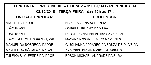 Solicitamos ampla divulgação aos Professores Ingressantes PEB II de sua Unidade Escolar, relacionados abaixo, que ocorrerá o I Encontro Presencial – REPESCAGEM do Curso Específico de Formação aos Ingressantes – Etapa 2, no dia 02/10/2018, das 13h às 17h, na Diretoria de Ensino – Região Centro (localizada na Av. Olavo Fontoura, 2.222 – Casa Verde).