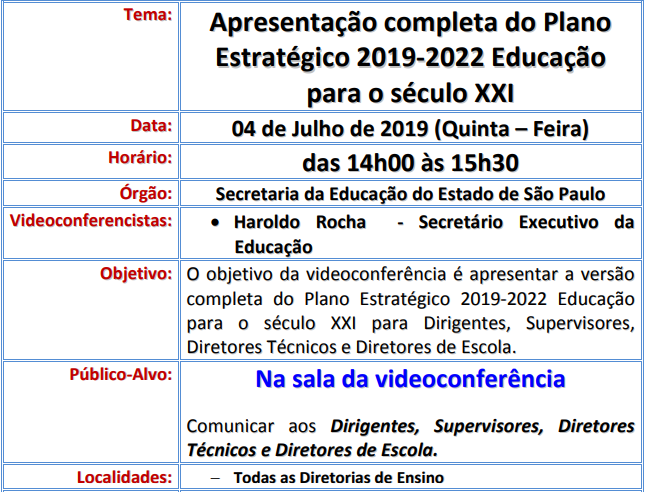 SENHORES DIRETORES DE ESCOLA – VIDEOCONFERÊNCIA. 04-07-19 Enviar por e-mail Assessoria. LEIA TAMBÉM RESULTADO DAS ENTREVISTAS PARA DESIGNAÇÃO DE DIRETOR ESCOLAR NOS TERMOS DA RESOLUÇÃO 28/2023 – EDITAL 29/2025 (EE PAULO SETÚBAL). EDITAL DE ENTREVISTAS PARA PROFESSOR – PEI. CLASSIFICAÇÃO INICIAL – PROFESSOR TUTOR. CONVITE DOS ESTUDANTES ELEGÍVEIS À EDUCAÇÃO ESPECIAL – ARTE SEM BARREIRAS! – EE ZULEIKA DE BARROS MARTINS FERREIRA.