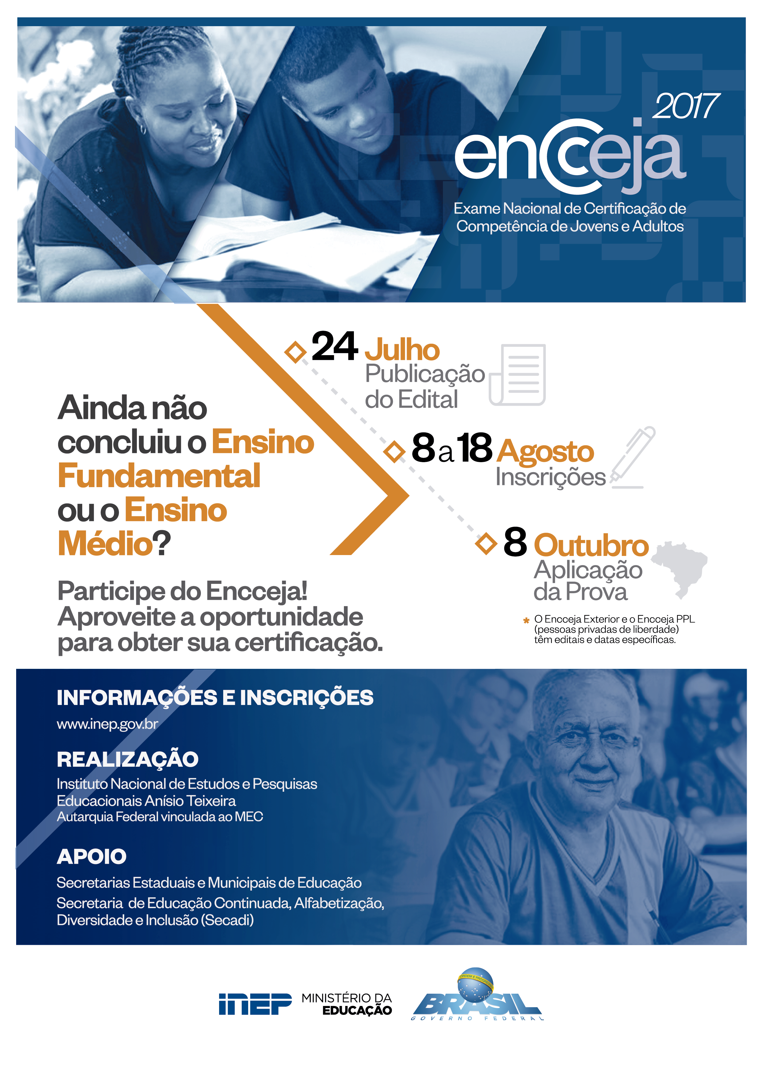 O INEP irá promover, no presente ano, o Exame Nacional de Certificação de Competência de Jovens e Adultos – ENCCEJA.