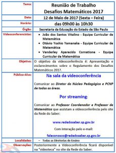 SENHORES DIRETORES, PROFESSORES COORDENADORES E PROFESSORES DE MATEMÁTICA – VIDEOCONFERÊNCIA – REUNIÃO DE TRABALHO DESAFIOS MATEMÁTICOS 2017. 10-05-17 Enviar por e-mail Núcleo Pedagógico. LEIA TAMBÉM RETIFICAÇÃO DA PUBLICAÇÃO DAS INSCRIÇÕES DEFERIDAS E INDEFERIDAS – PROFESSOR TUTOR ANOS INICIAIS. ESTÃO ABERTAS AS INSCRIÇÕES PARA MINISTRAR AULAS DE CURSO TÉCNICO DA SEDUC – SP! EDITAL SELEÇÃO DE PROFESSORES PARA AS ESCOLAS OLÍMPICAS FEVEREIRO DE 2026. EDITAL N° 01/2026 – PROCESSO DE SELEÇÃO PÚBLICA DE ESTAGIÁRIOS.