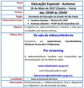 SENHORES DIRETORES – VIDEOCONFERÊNCIA – EDUCAÇÃO ESPECIAL – AUTISMO. 17-05-1717 de maio de 2017 Enviar por e-mail Núcleo Pedagógico. LEIA TAMBÉM EDITAL 02/2026 – PROCESSO SELETIVO PARA ATRIBUIÇÃO DE AULAS DE PROFESSOR ORIENTADOR DE CONVIVÊNCIA – POC – UNIDADE REGIONAL DE ENSINO CENTRO EDITAL 02/2026 – PROCESSO SELETIVO PARA ATRIBUIÇÃO DE AULAS DE PROFESSOR ORIENTADOR DE CONVIVÊNCIA – POC – UNIDADE REGIONAL DE ENSINO CENTRO. CIPA – CONVOCAÇÃO DOS CIPEIROS ELEITOS – DOE 03/02/2026. EDITAL 02 2026 EJA CURSO FLEXÍVEL 2026