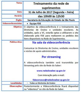 SENHORES DIRETORES – VIDEOCONFERÊNCIA: TREINAMENTO DA REDE DE SUPRIMENTOS. 28-07-17 Enviar por e-mail Assessoria. LEIA TAMBÉM EDITAL Nº 01/2026 PARA PROCESSO SELETIVO DE DOCENTES PARA O PROGRAMA PROFESSOR TUTOR ANOS INICIAIS 2026. EDITAL – VAGA DE COORDENAÇÃO DE GESTÃO PEDAGÓGICA ANOS INICIAIS – EF – EE DAILY RESENDE FRANÇA PROFESSOR, DE 29 DE JANEIRO DE 2026. ATENÇÃO! INSCRIÇÕES ABERTAS PARA AS AULAS OLÍMPICAS 2026! VAGAS DE ESTÁGIO – EDITAL Nº 01/2026 – PROATI.