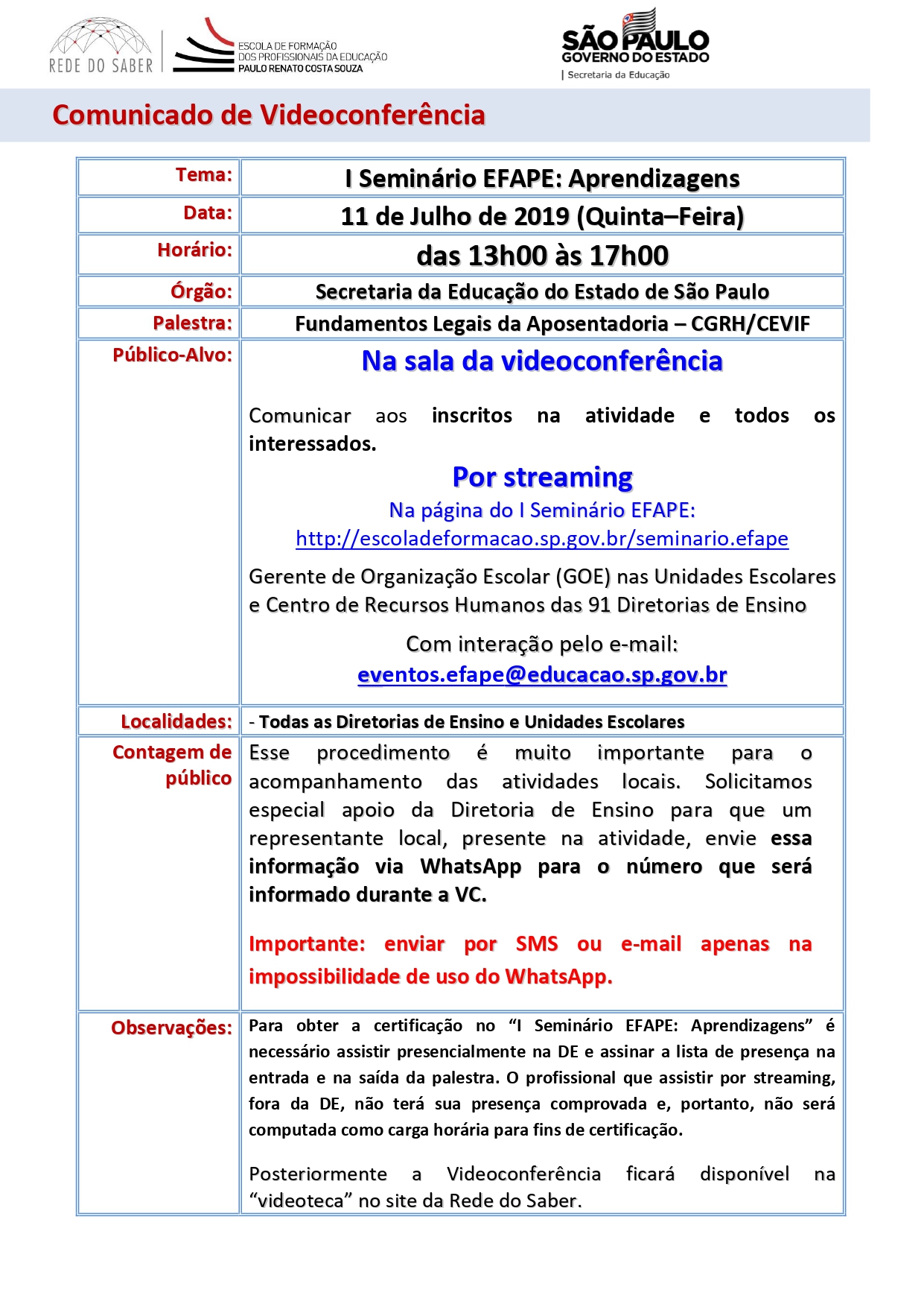 SENHORES GERENTES DE ORGANIZAÇÃO ESCOLAR (GOE) – COMUNICADO DE VIDEOCONFERÊNCIA – STREAMING – I SEMINÁRIO EFAPE: APRENDIZAGENS. 11-07-19 Enviar por e-mail LEIA TAMBÉM EDITAL PARA O PREENCHIMENTO DE VAGA DE PROFESSOR DO CENTRO DE INOVAÇÃO DA EDUCAÇÃO BÁSICA PAULISTA (CIEBP) – UNIDADE REGIONAL DE ENSINO REGIÃO CENTRO – VINCULADO À EE PROFESSORA ZULEIKA DE BARROS MARTINS FERREIRA. EDITAL PROFESSOR DO PROJETO DE APOIO AO PROTAGONISMO ESTUDANTIL. EDITAL 01/2026 – PROCESSO SELETIVO PARA ATRIBUIÇÃO DE AULAS DE PROFESSOR ORIENTADOR DE CONVIVÊNCIA – POC – UNIDADE REGIONAL DE ENSINO CENTRO. EDITAL SALA DE LEITURA, DE 29 DE JANEIRO DE 2026