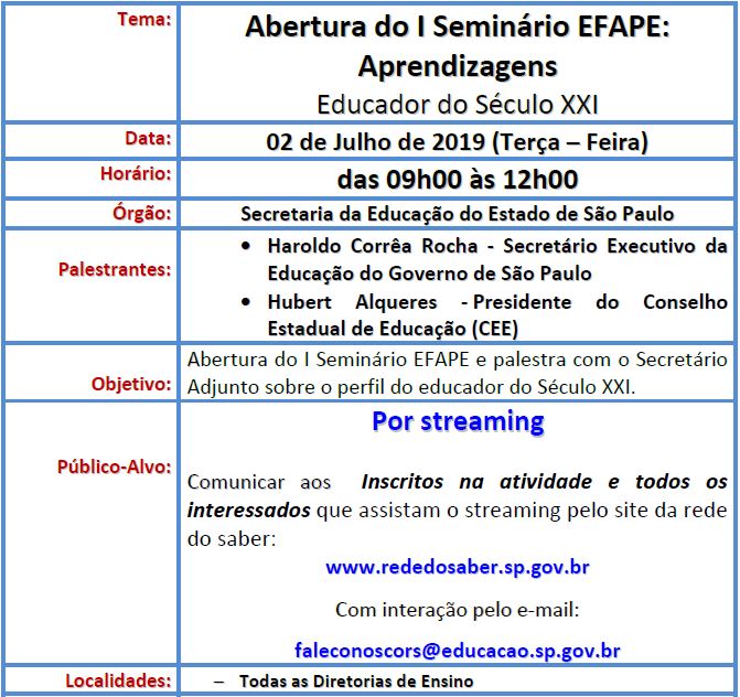SENHORES INSCRITOS NO I SEMINÁRIO EFAPE: APRENDIZAGENS – EDUCADOR DO SÉCULO XXI – VIDEOCONFERÊNCIA POR STREAMING. 01-07-191 de julho de 2019 Enviar por e-mail NPE DER CTR. LEIA TAMBÉM RESULTADO DAS ENTREVISTAS PARA DESIGNAÇÃO DE DIRETOR ESCOLAR NOS TERMOS DA RESOLUÇÃO 28/2023 – EDITAL 29/2025 (EE PAULO SETÚBAL). EDITAL DE ENTREVISTAS PARA PROFESSOR – PEI. CLASSIFICAÇÃO INICIAL – PROFESSOR TUTOR. CONVITE DOS ESTUDANTES ELEGÍVEIS À EDUCAÇÃO ESPECIAL – ARTE SEM BARREIRAS! – EE ZULEIKA DE BARROS MARTINS FERREIRA.