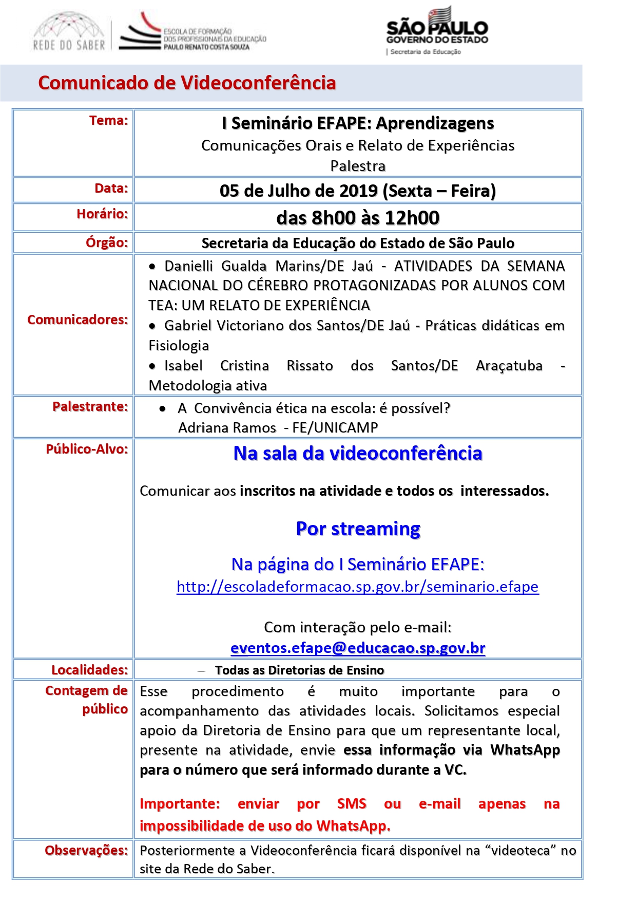 SENHORES INSCRITOS NO I SEMINÁRIO EFAPE – COMUNICADO DA VIDEOCONFERÊNCIA – APRENDIZAGENS – COMUNICAÇÕES ORAIS E RELATO DE EXPERIÊNCIAS. 04-07-19 Enviar por e-mail LEIA TAMBÉM EDITAL PROFESSOR DO PROJETO DE APOIO AO PROTAGONISMO ESTUDANTIL. EDITAL 01/2026 – PROCESSO SELETIVO PARA ATRIBUIÇÃO DE AULAS DE PROFESSOR ORIENTADOR DE CONVIVÊNCIA – POC – UNIDADE REGIONAL DE ENSINO CENTRO. EDITAL SALA DE LEITURA, DE 29 DE JANEIRO DE 2026 EDITAL DE ABERTURA DE INSCRIÇÕES PARA AGENTE DE ORGANIZAÇÃO ESCOLAR – EE TARCÍSIO ÁLVARES LOBO.