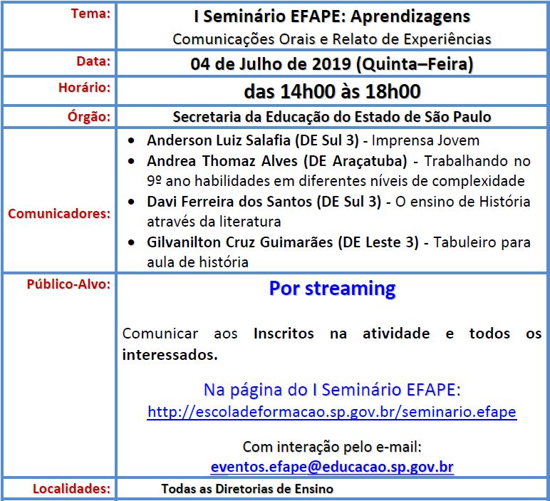 SENHORES INSCRITOS NO I SEMINÁRIO EFAPE: COMUNICADO DE STREAMING: COMUNICAÇÕES ORAIS E RELATO DE EXPERIÊNCIAS. 03-07-193 de julho de 2019 Enviar por e-mail NPE DER CTR. LEIA TAMBÉM RESULTADO DAS ENTREVISTAS PARA DESIGNAÇÃO DE DIRETOR ESCOLAR NOS TERMOS DA RESOLUÇÃO 28/2023 – EDITAL 29/2025 (EE PAULO SETÚBAL). EDITAL DE ENTREVISTAS PARA PROFESSOR – PEI. CLASSIFICAÇÃO INICIAL – PROFESSOR TUTOR. CONVITE DOS ESTUDANTES ELEGÍVEIS À EDUCAÇÃO ESPECIAL – ARTE SEM BARREIRAS! – EE ZULEIKA DE BARROS MARTINS FERREIRA.