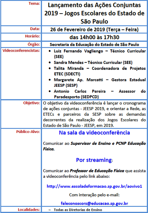 SENHORES PROFESSORES DE EDUCAÇÃO FÍSICA – COMUNICADO DE VIDEOCONFERÊNCIA POR STREAMING – LANÇAMENTO DAS AÇÕES CONJUNTAS 2019 – JOGOS ESCOLARES DO ESTADO DE SÃO PAULO. 25-02-19 Enviar por e-mail LEIA TAMBÉM EDITAIS DE ABERTURA DE INSCRIÇÕES PARA AGENTE DE ORGANIZAÇÃO ESCOLAR – FEV. 2026. EDITAL 02/2026 DOS DOCENTES DEFERIDOS/ INDEFERIDOS DO PROCESSO SELETIVO INICIAL SIMPLIFICADO PARA ATUAR NO CURSO DE PRESENÇA FLEXÍVEL. CONTRATAÇÃO AOE – VAGAS, CANDIDATOS E CRONOGRAMA – FEV. 2026 DEFERIMENTO DAS INSCRIÇÕES PARA DESIGNAÇÃO DE DIRETOR DE ESCOLA NOS TERMOS DA RESOLUÇÃO 28/2023 – EDITAL 03/2026 (EE JOAQUIM LEME DO PRADO, PROF.).