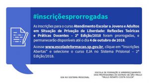 SENHORES PROFESSORES – INSCRIÇÕES PRORROGADAS PARA O CURSO ATENDIMENTO ESCOLAR A JOVENS E ADULTOS EM SITUAÇÃO DE PRIVAÇÃO DE LIBERDADE. 02-10-18 Enviar por e-mail NPE DER CTR. LEIA TAMBÉM EDITAIS DE ABERTURA DE INSCRIÇÕES PARA AGENTE DE ORGANIZAÇÃO ESCOLAR – FEV. 2026. EDITAL 02/2026 DOS DOCENTES DEFERIDOS/ INDEFERIDOS DO PROCESSO SELETIVO INICIAL SIMPLIFICADO PARA ATUAR NO CURSO DE PRESENÇA FLEXÍVEL. CONTRATAÇÃO AOE – VAGAS, CANDIDATOS E CRONOGRAMA – FEV. 2026 DEFERIMENTO DAS INSCRIÇÕES PARA DESIGNAÇÃO DE DIRETOR DE ESCOLA NOS TERMOS DA RESOLUÇÃO 28/2023 – EDITAL 03/2026 (EE JOAQUIM LEME DO PRADO, PROF.).
