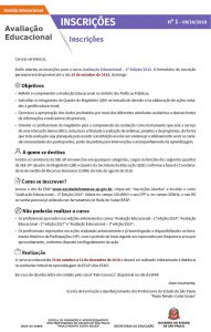 SENHORES SERVIDORES – BOLETIM 01 – AVALIAÇÃO EDUCACIONAL – DIVULGAÇÃO DAS INSCRIÇÕES. 09-10-18 Enviar por e-mail NPE DER CTR. LEIA TAMBÉM EDITAIS DE ABERTURA DE INSCRIÇÕES PARA AGENTE DE ORGANIZAÇÃO ESCOLAR – FEV. 2026. EDITAL 02/2026 DOS DOCENTES DEFERIDOS/ INDEFERIDOS DO PROCESSO SELETIVO INICIAL SIMPLIFICADO PARA ATUAR NO CURSO DE PRESENÇA FLEXÍVEL. CONTRATAÇÃO AOE – VAGAS, CANDIDATOS E CRONOGRAMA – FEV. 2026 DEFERIMENTO DAS INSCRIÇÕES PARA DESIGNAÇÃO DE DIRETOR DE ESCOLA NOS TERMOS DA RESOLUÇÃO 28/2023 – EDITAL 03/2026 (EE JOAQUIM LEME DO PRADO, PROF.).