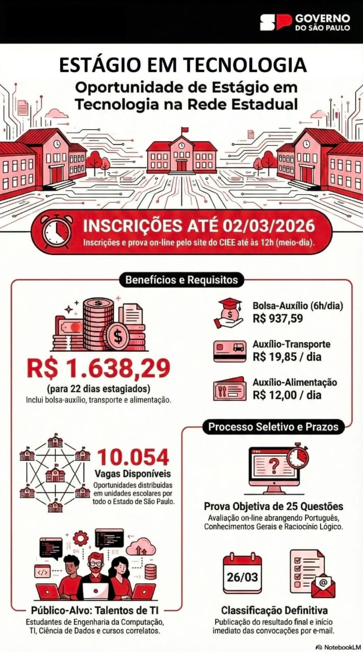 A Secretaria da Educação do Estado de São Paulo – SEDUC-SP informa que estão abertas as inscrições para o PROATI – Programa de Apoio à Tecnologia da Informação, destinado à seleção de 10.054 estudantes para atuação como estagiários nas unidades escolares da Rede Estadual.